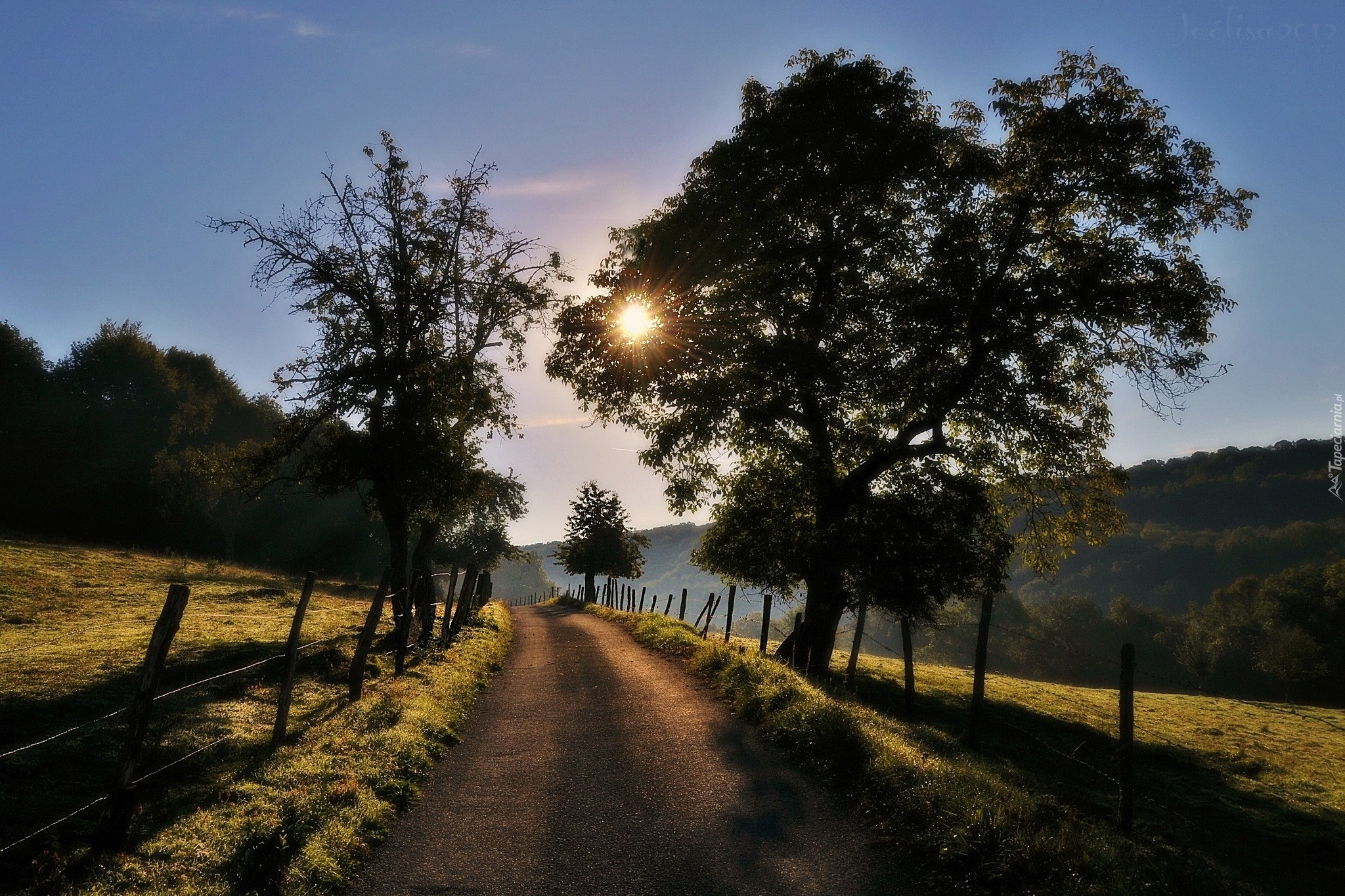 Edytor tapety: Droga, Drzewa, Poranek, Promienie Słońca
