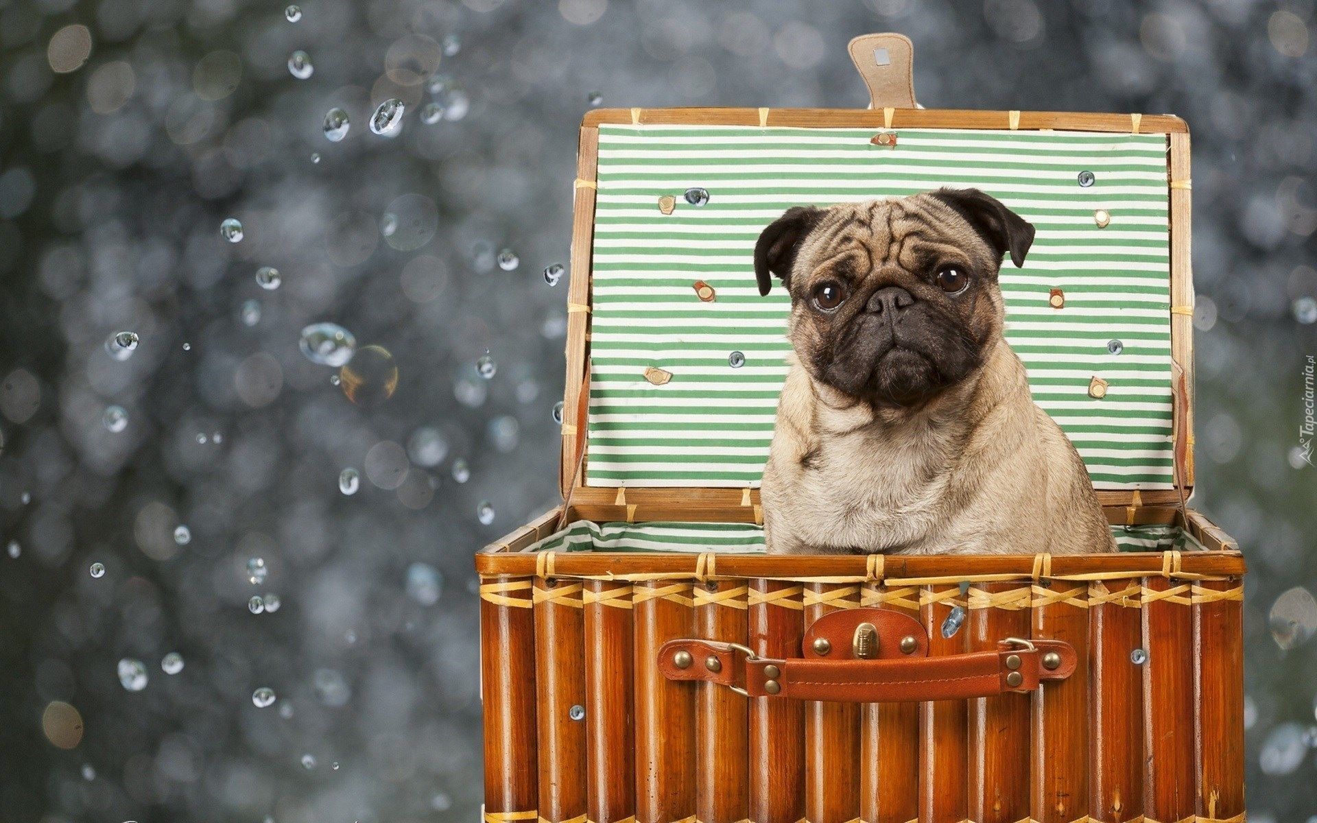 Edytor tapety: Pies, Mops, Walizka, Krople, Wody