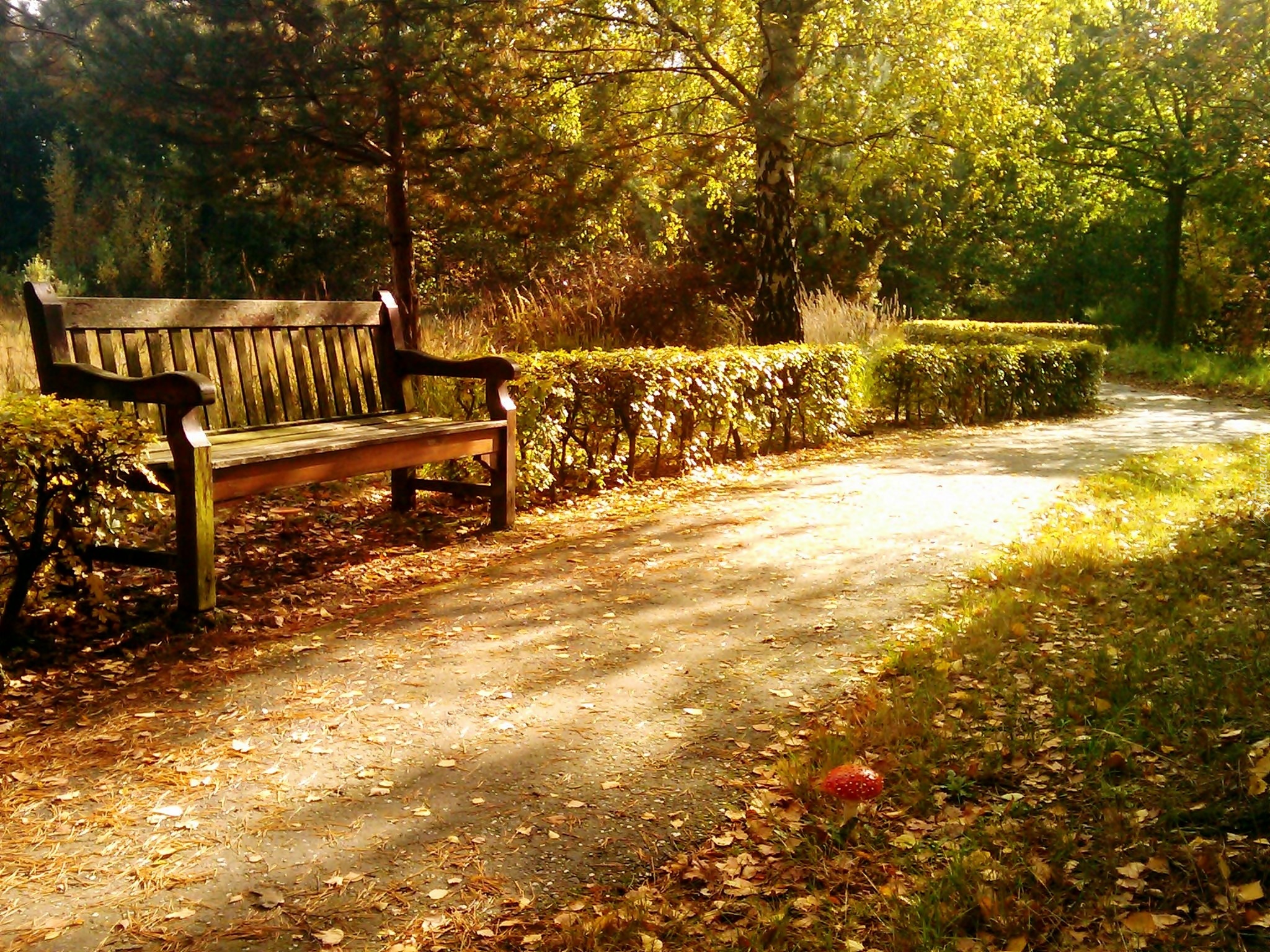 Edytor tapety: Park, Aleja, Ławeczka, Opadłe, Liście, Muchomór