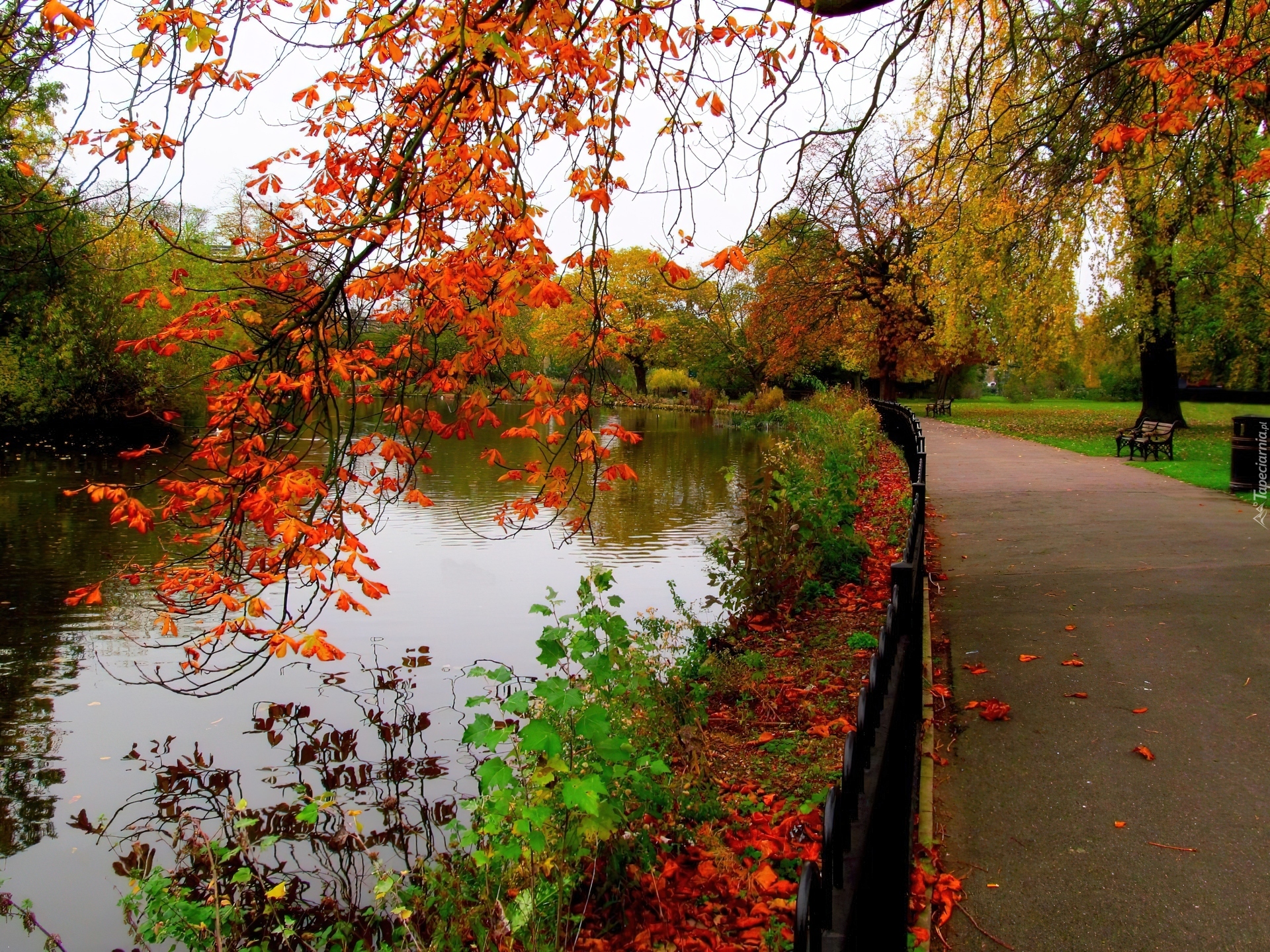 Edytor tapety: Park, Aleja, Staw, Ławki, Jesień, Drzewa