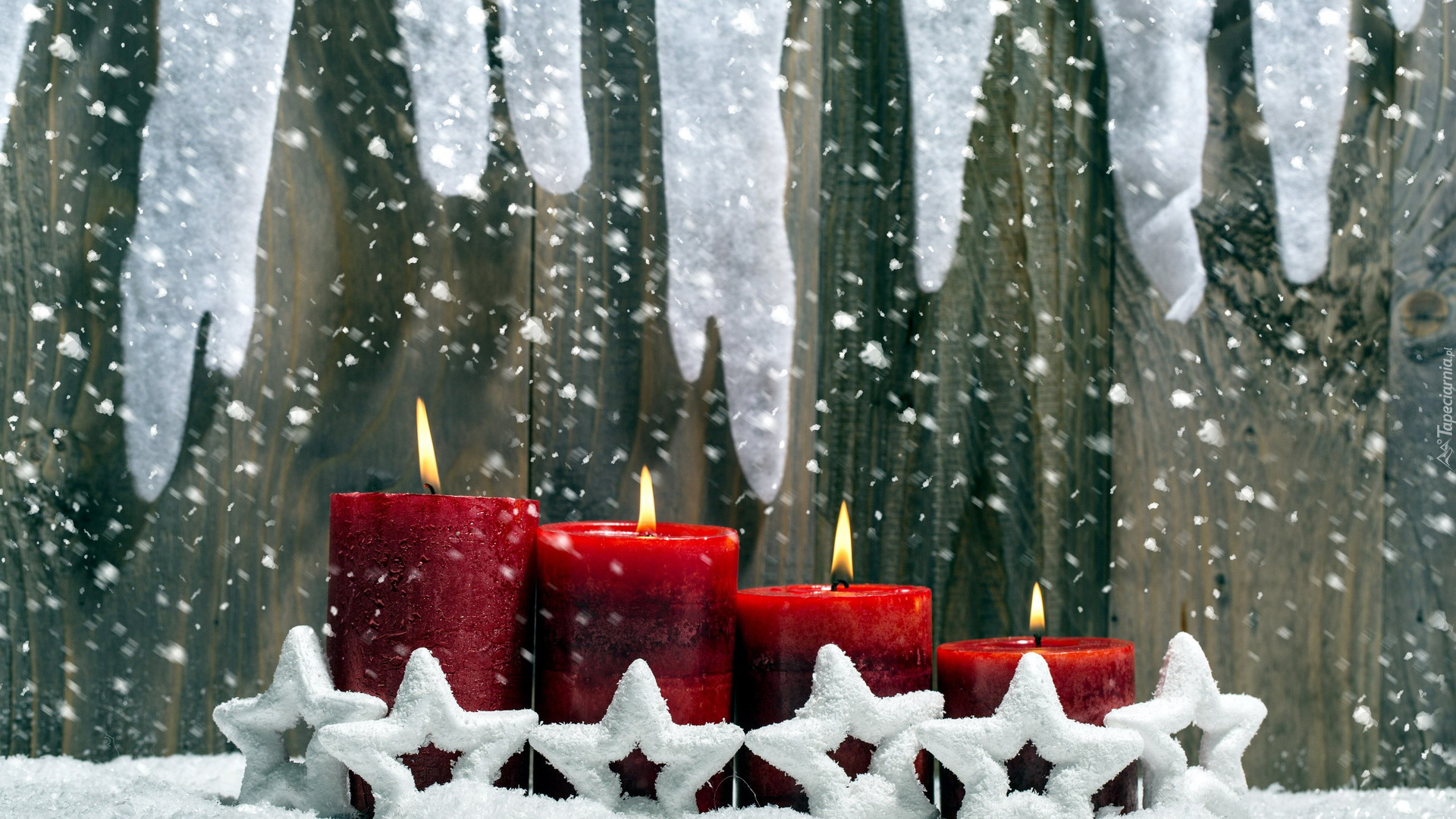 Edytor tapety: Czerwone, Świece, Gwiazdki, Śnieg, Dekoracja, Świąteczna
