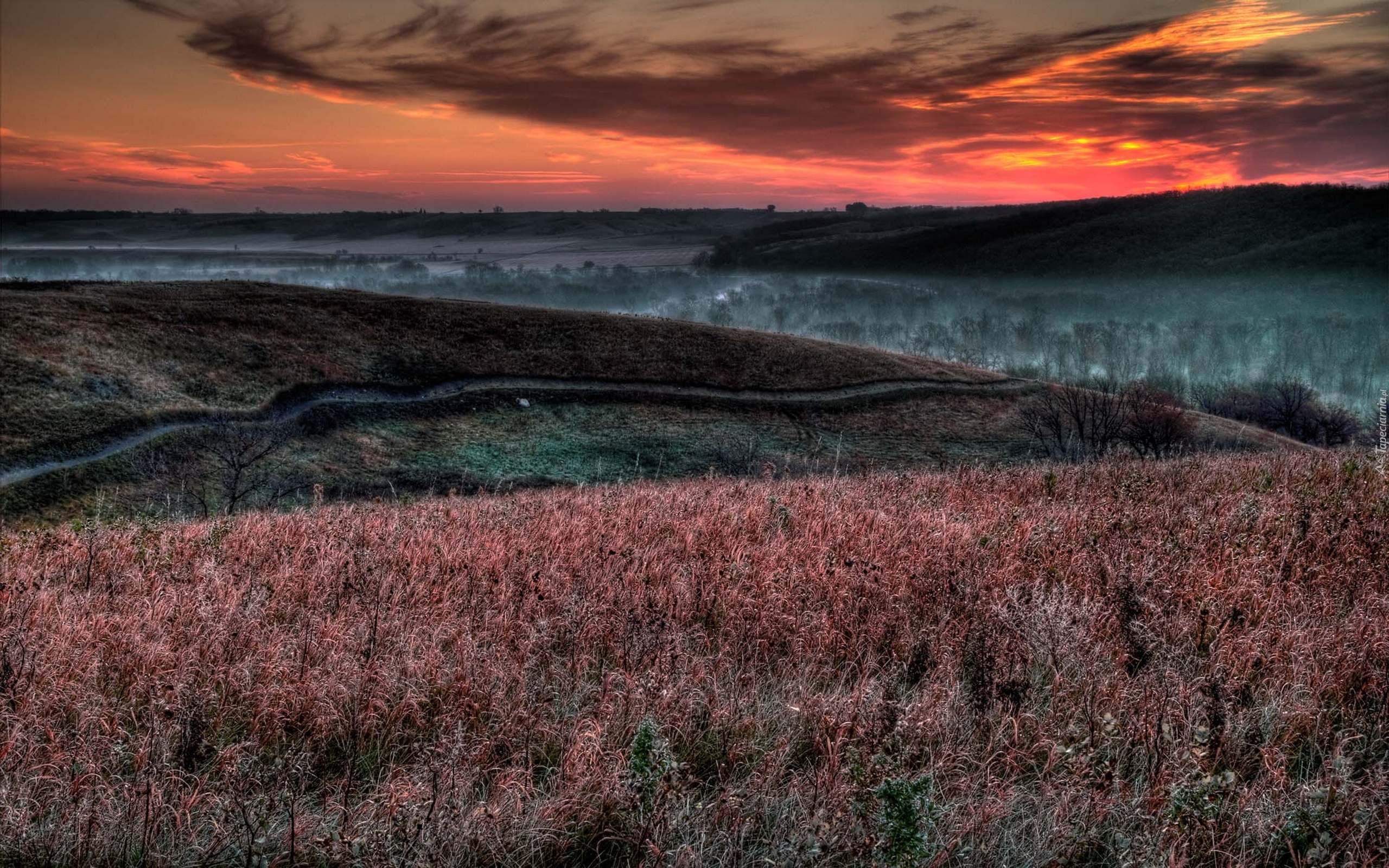 Edytor tapety: Łąka, Las, Niebo, Zachód Słońca
