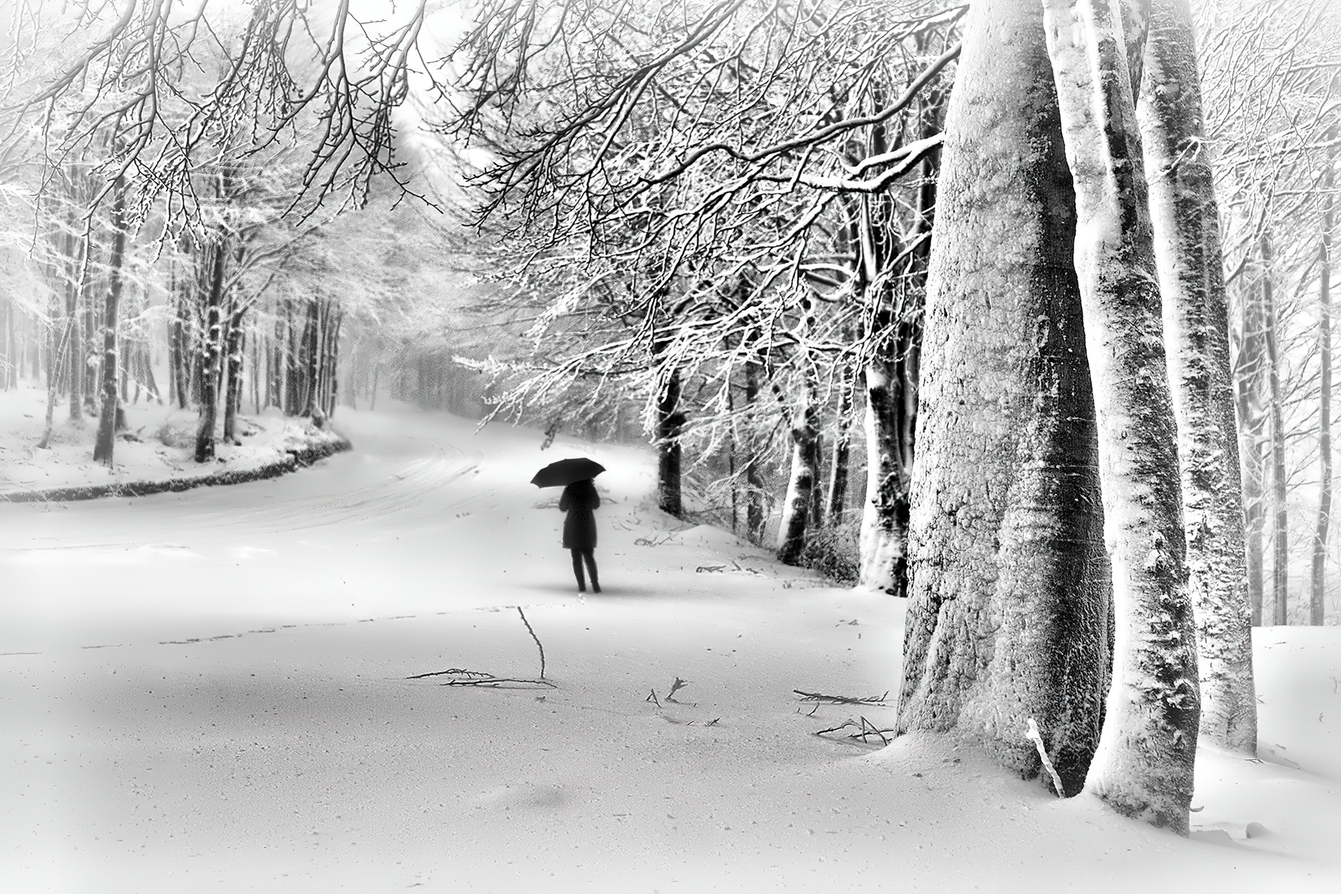 Edytor tapety: Droga, Drzewa, Śnieg, Postać, Parasol