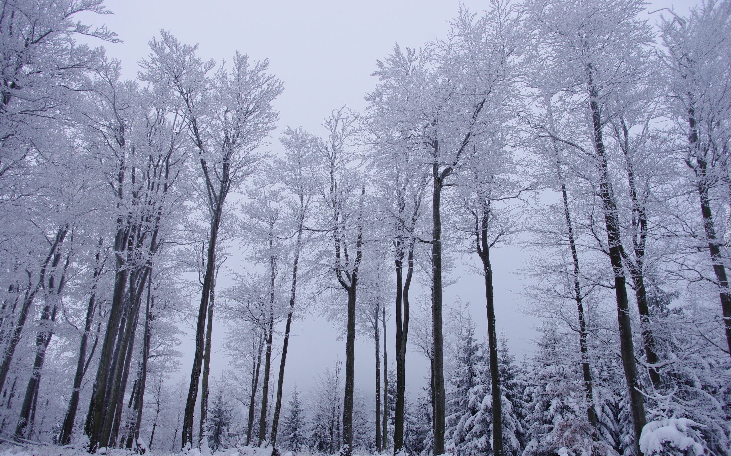 Edytor tapety: Wysokie, Drzewa, Las, Mgła, Zima