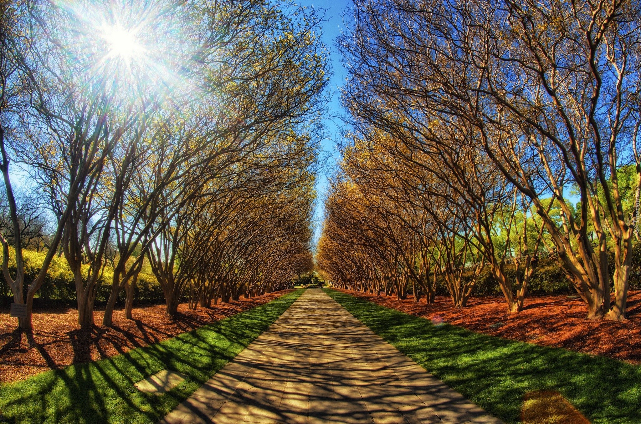 Edytor tapety: Droga, Drzewa, Promienie, Słońca, Park