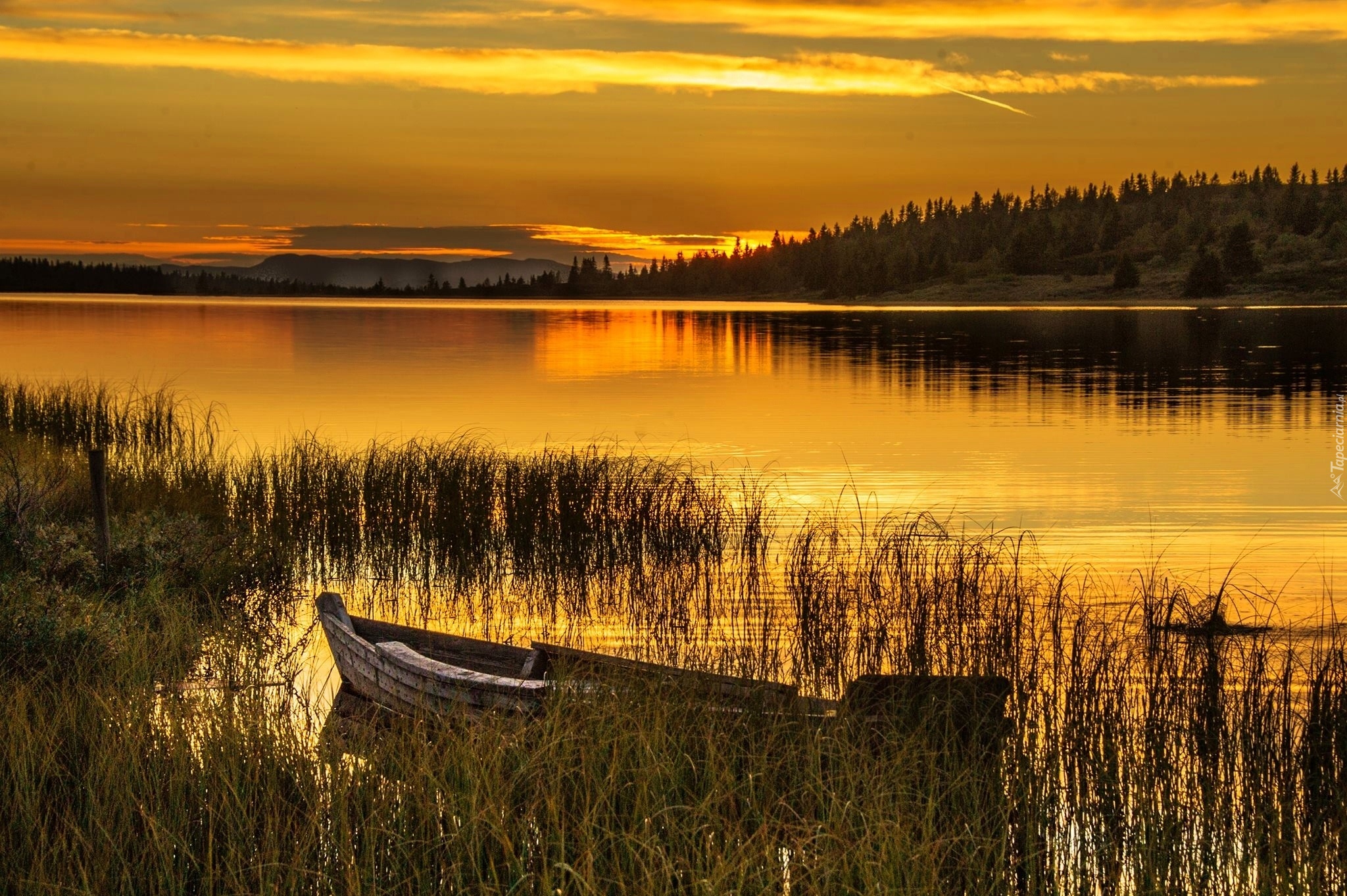 Edytor tapety: Zachód, Słońca, Jezioro, Łódka