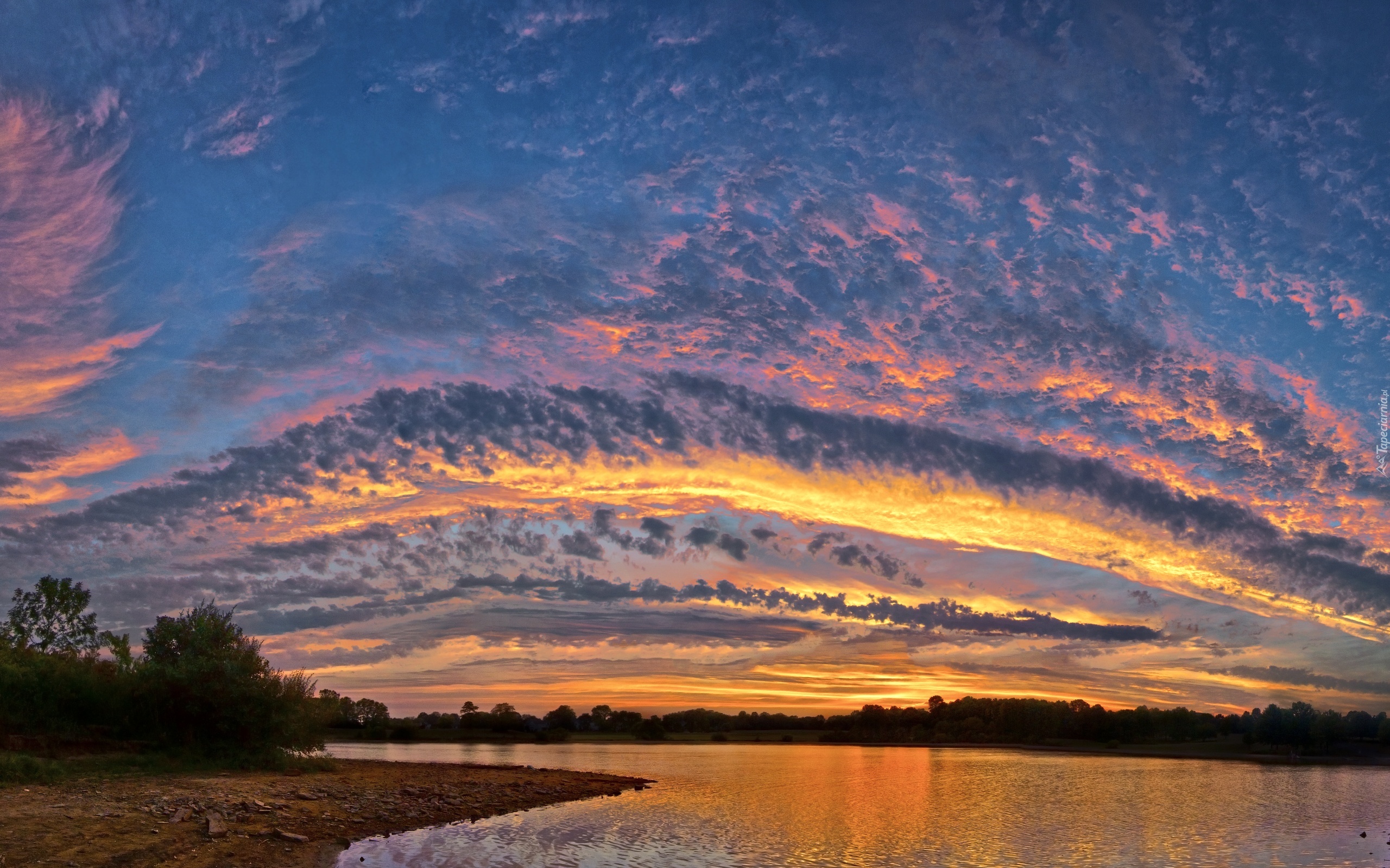 Edytor tapety: Rzeka, Drzewa, Kamienie, Chmury, Zachód, Słońca