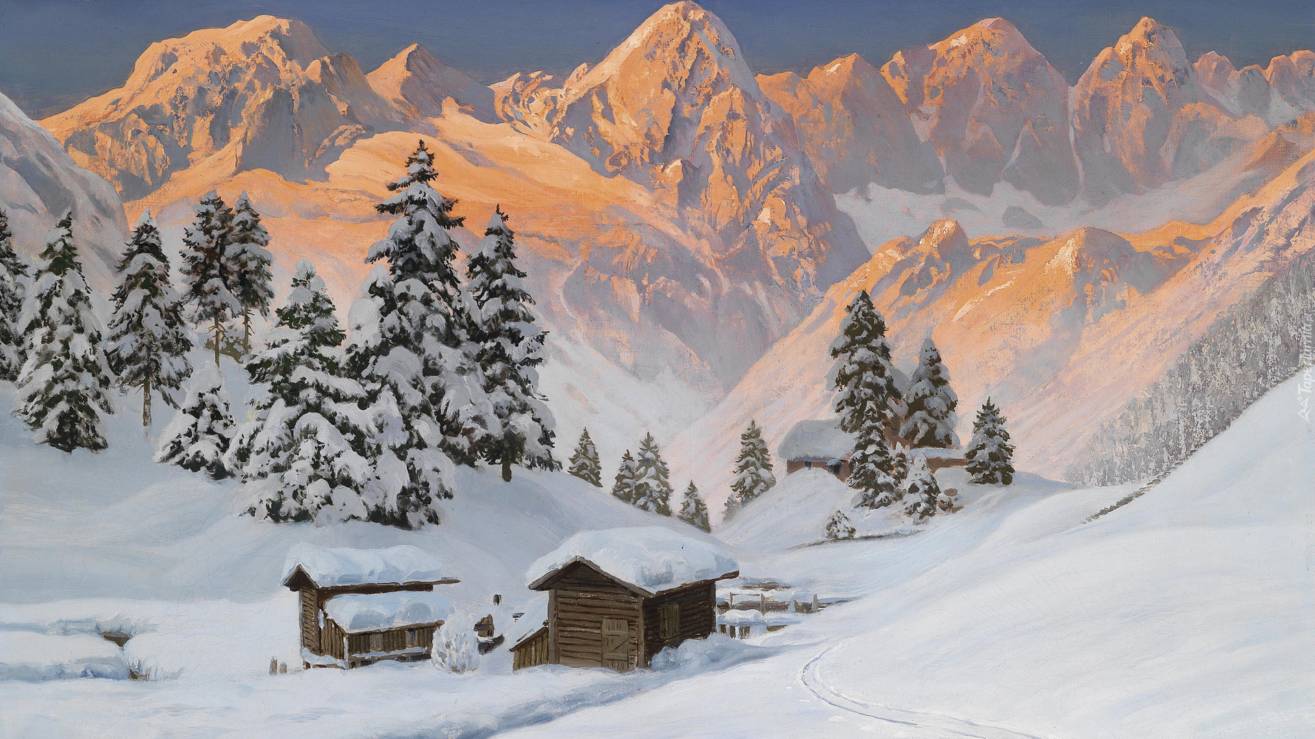 Edytor tapety: Zima, Góry, Drzewa, Obraz, Alois Arnegger