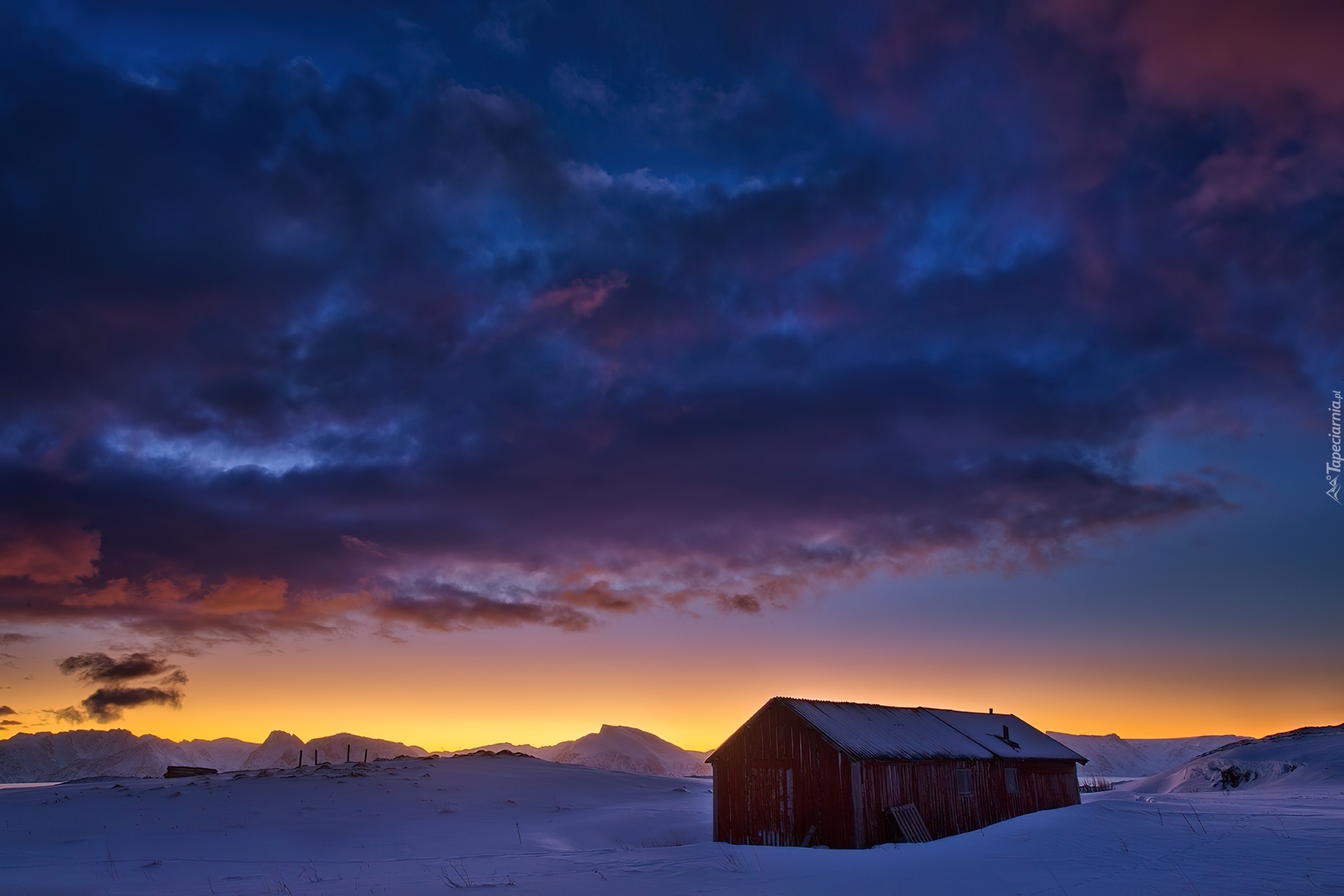 Edytor tapety: Zachód, Słońca, Szopa, Śnieg, Chmury