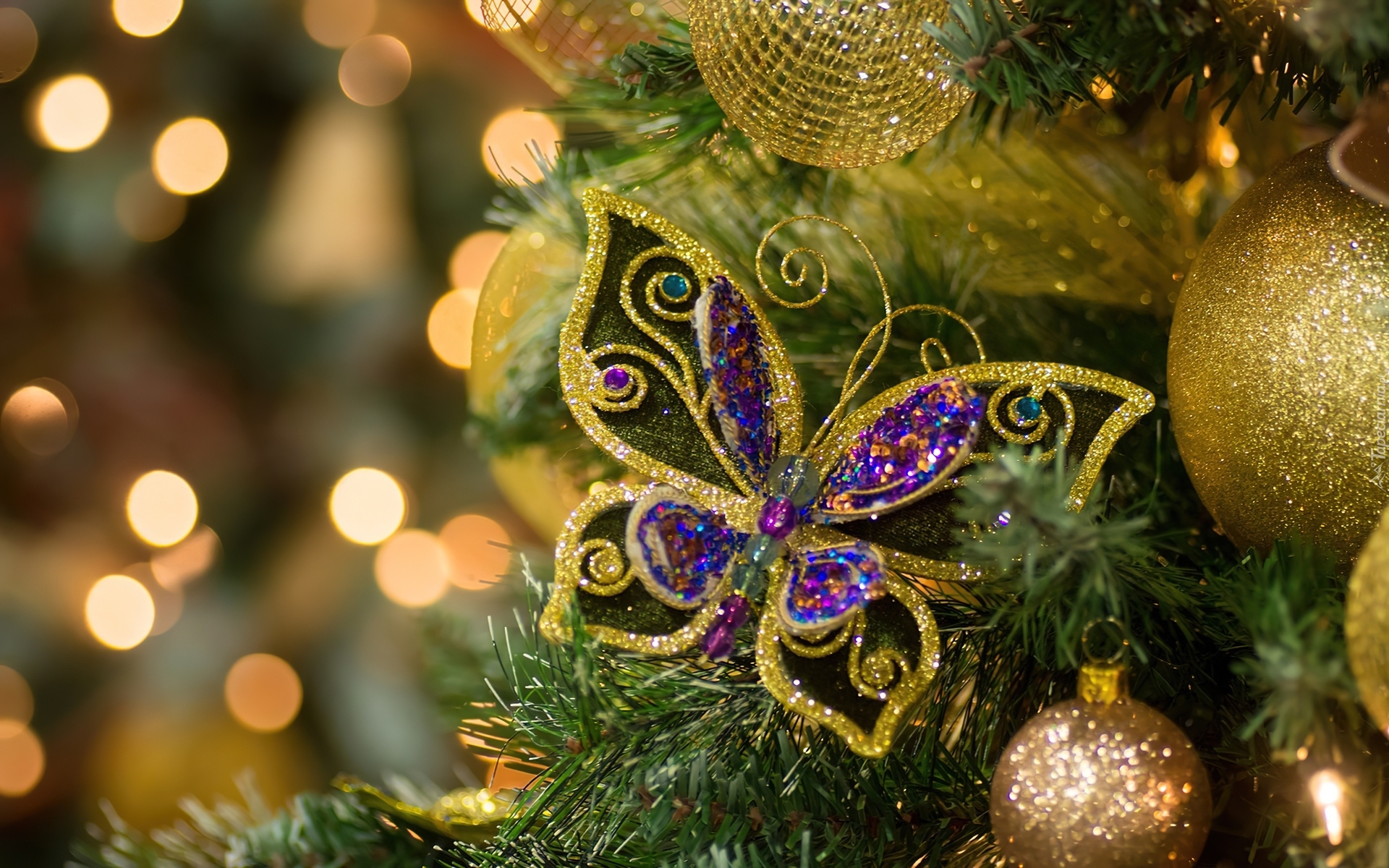 Edytor tapety: Boże, Narodzenie, Choinka, Złote, Bombki, Motylek, Ozdoby