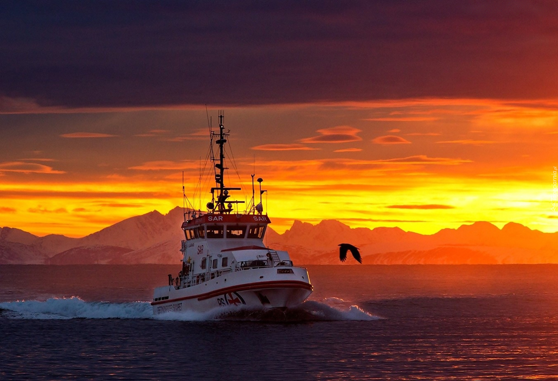 Edytor tapety: Statek, Zachód, Słońca, Morze, Ptak