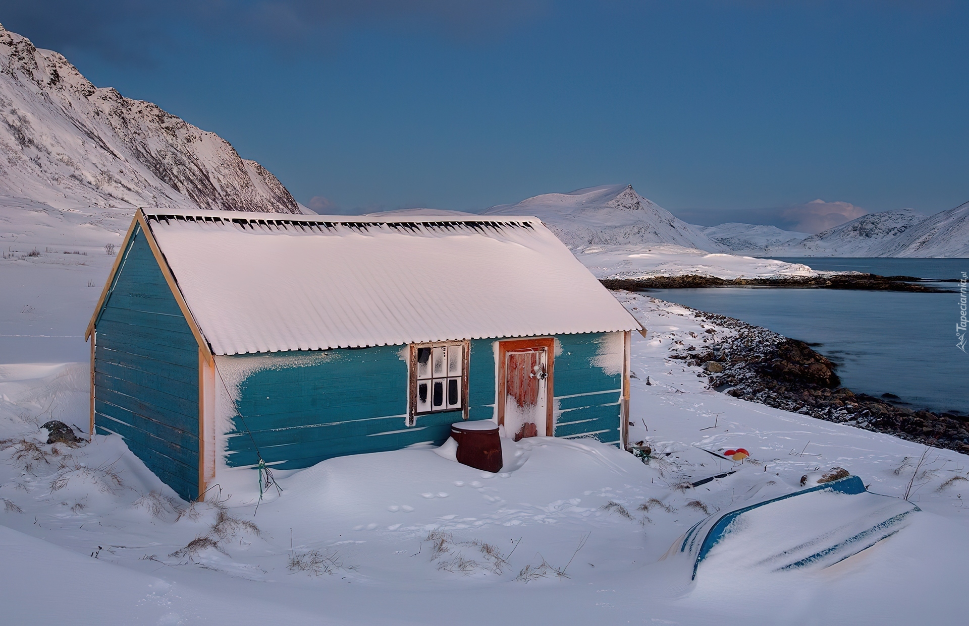 Edytor tapety: Domek, Śnieg, Rzeka, Góry