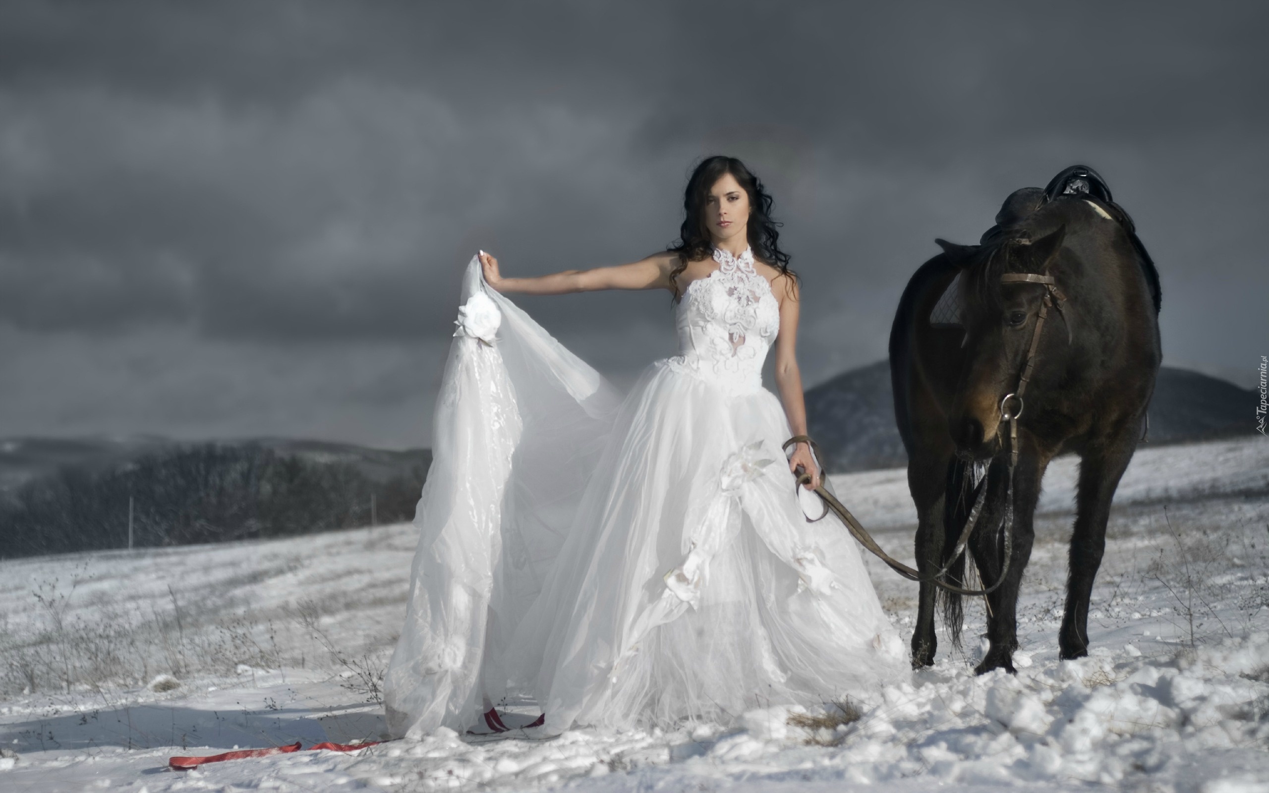 Edytor tapety: Kobieta, Koń, Góry, Zima