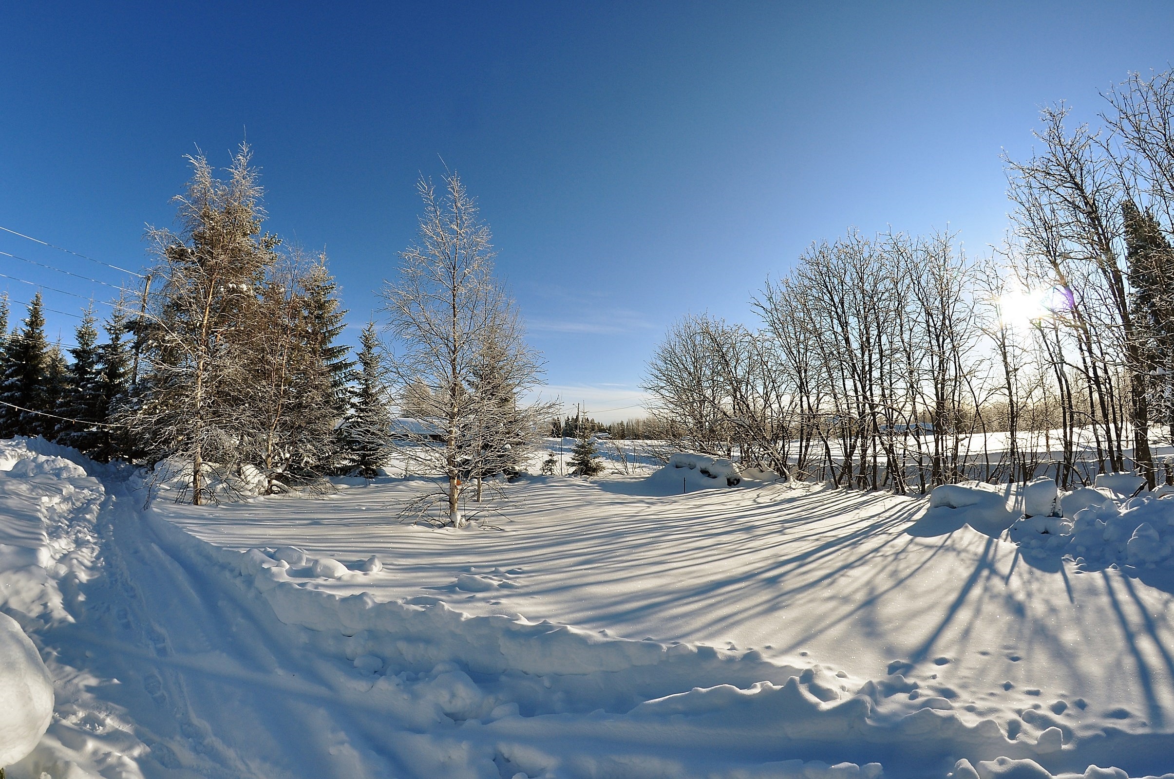 Edytor tapety: Zima, Dróżka, Drzewa, Wschód Słońca