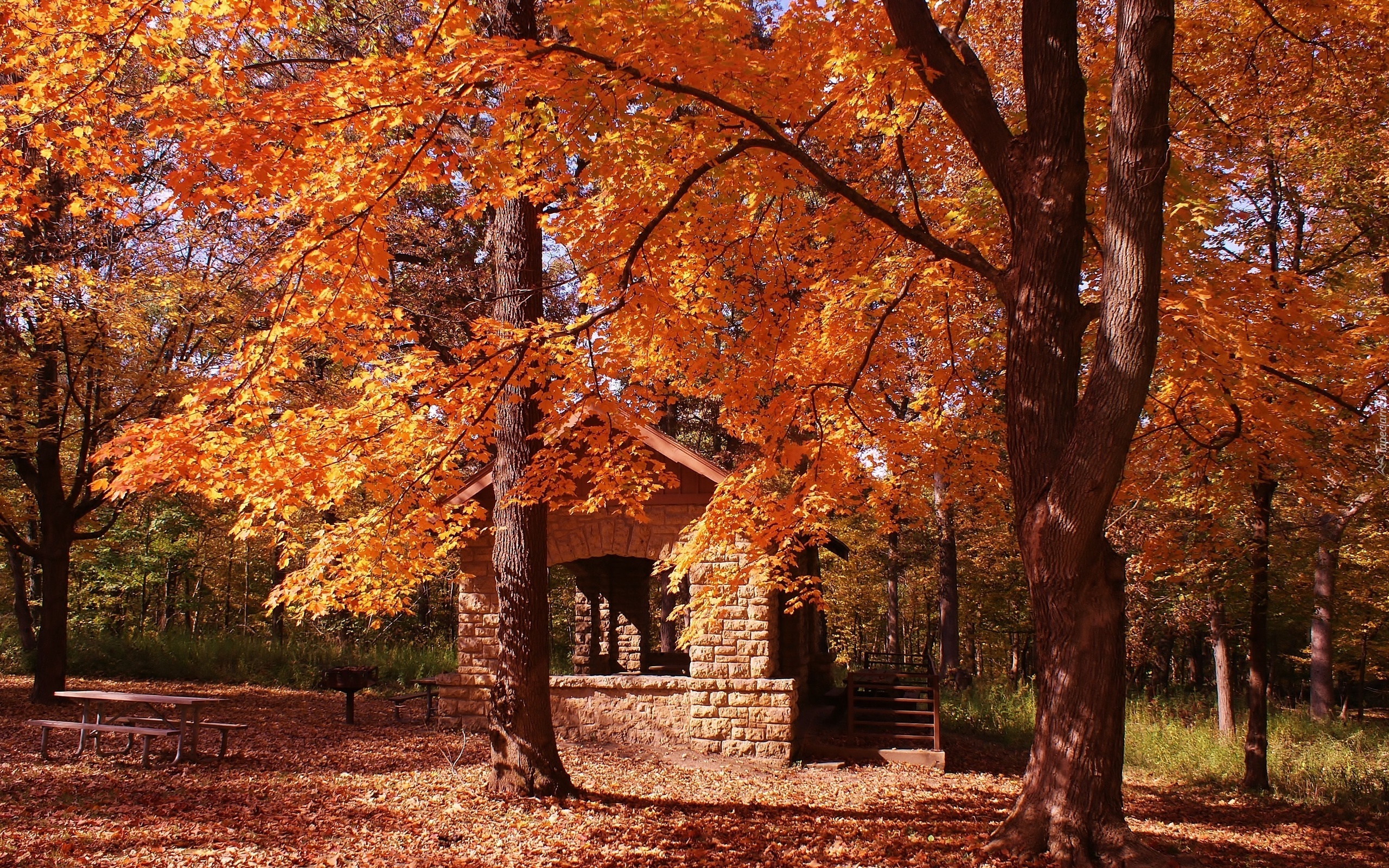 Edytor tapety: Park, Domek, Ławki, Liście, Jesień