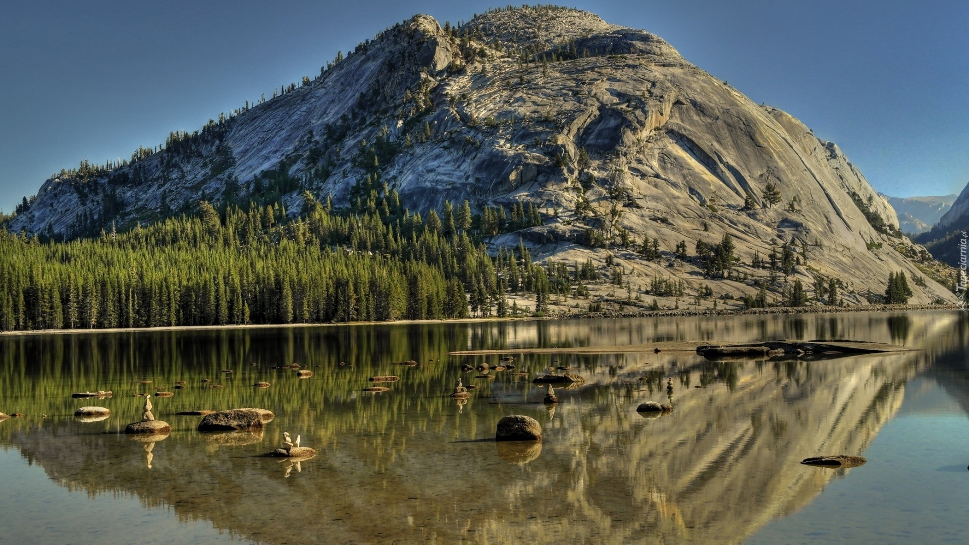 Edytor tapety: Góry, Drzewa, Jezioro, Kamienie, Odbicie