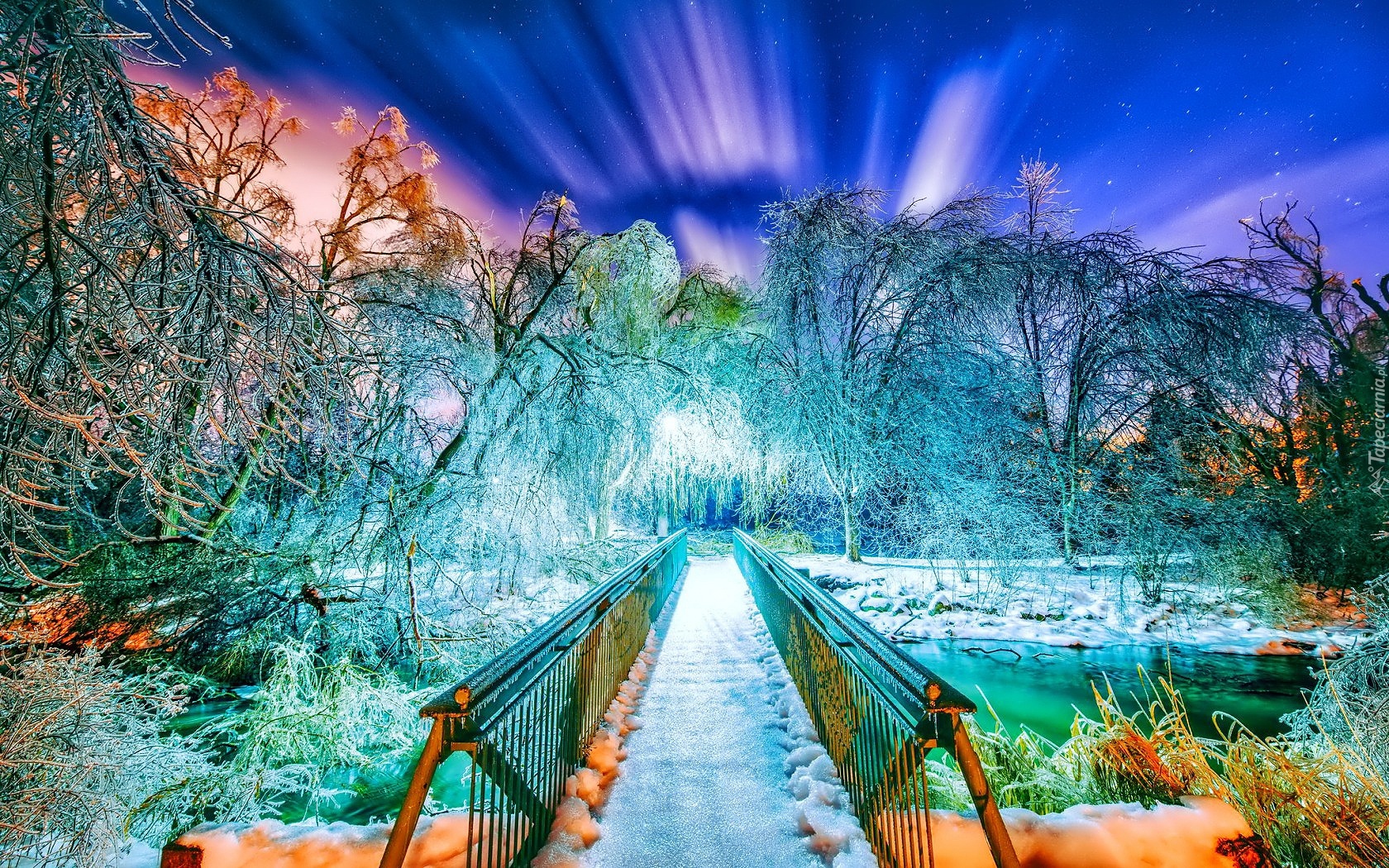 Edytor tapety: Fantasy, Most, Rzeka, Drzewa, Śnieg, Zorza