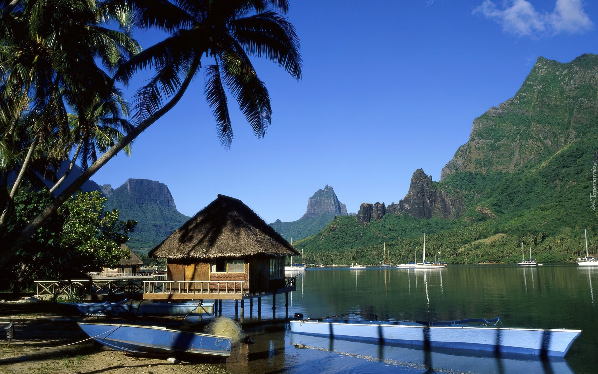 Edytor tapety: Wyspa Moorea, Zatoka Cooka, Łodzie, Żaglówki, Palmy, Góry
