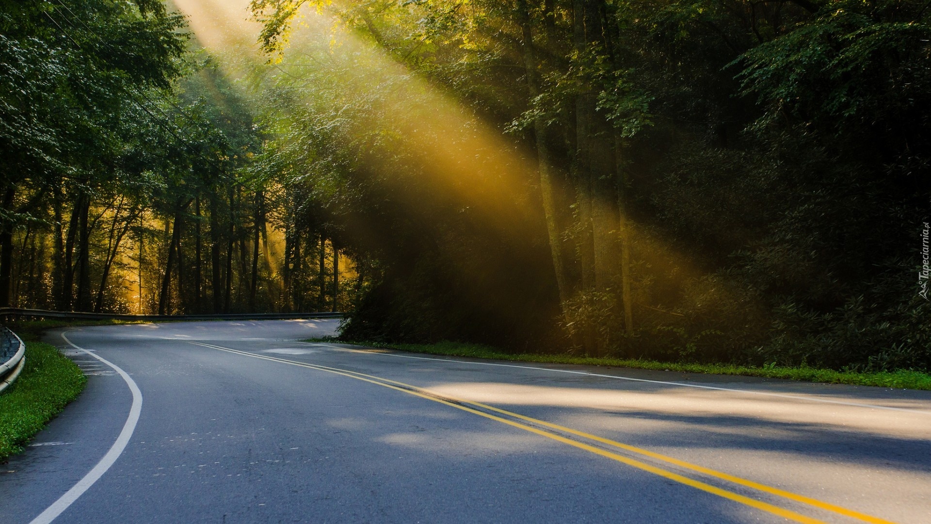 Edytor tapety: Droga, Las, Promienie, Słońca