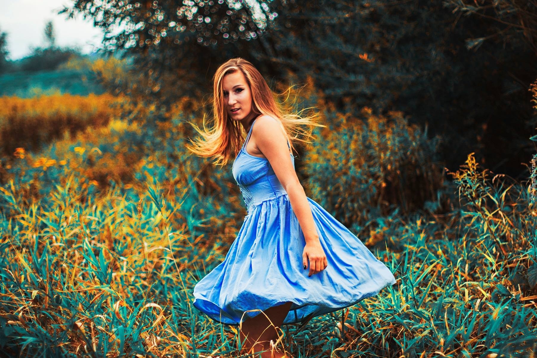 Edytor tapety: Kobieta, Blondynka, Niebieska, Sukienka