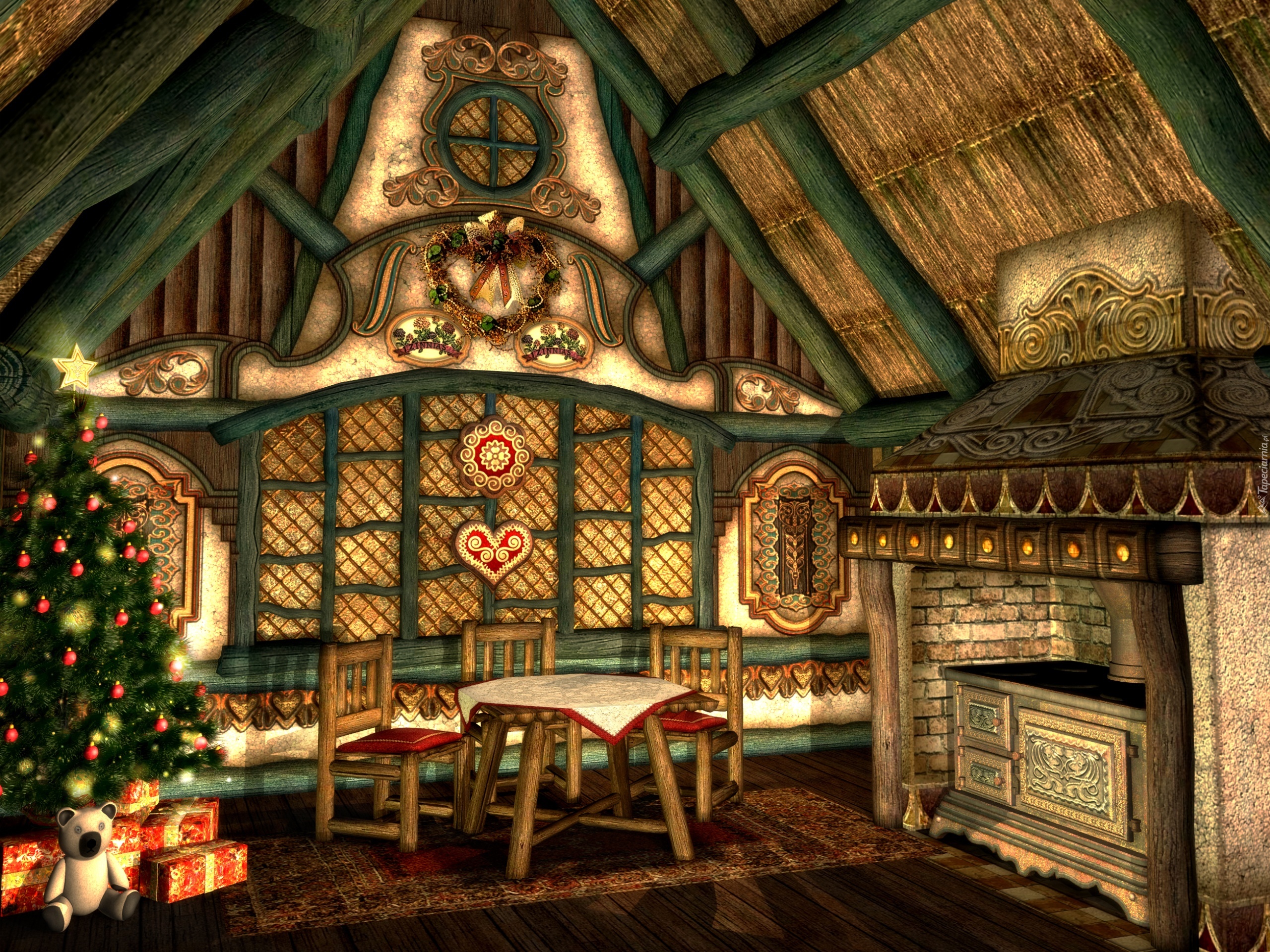 Edytor tapety: Dom, Pokój, Choinka, Kominek