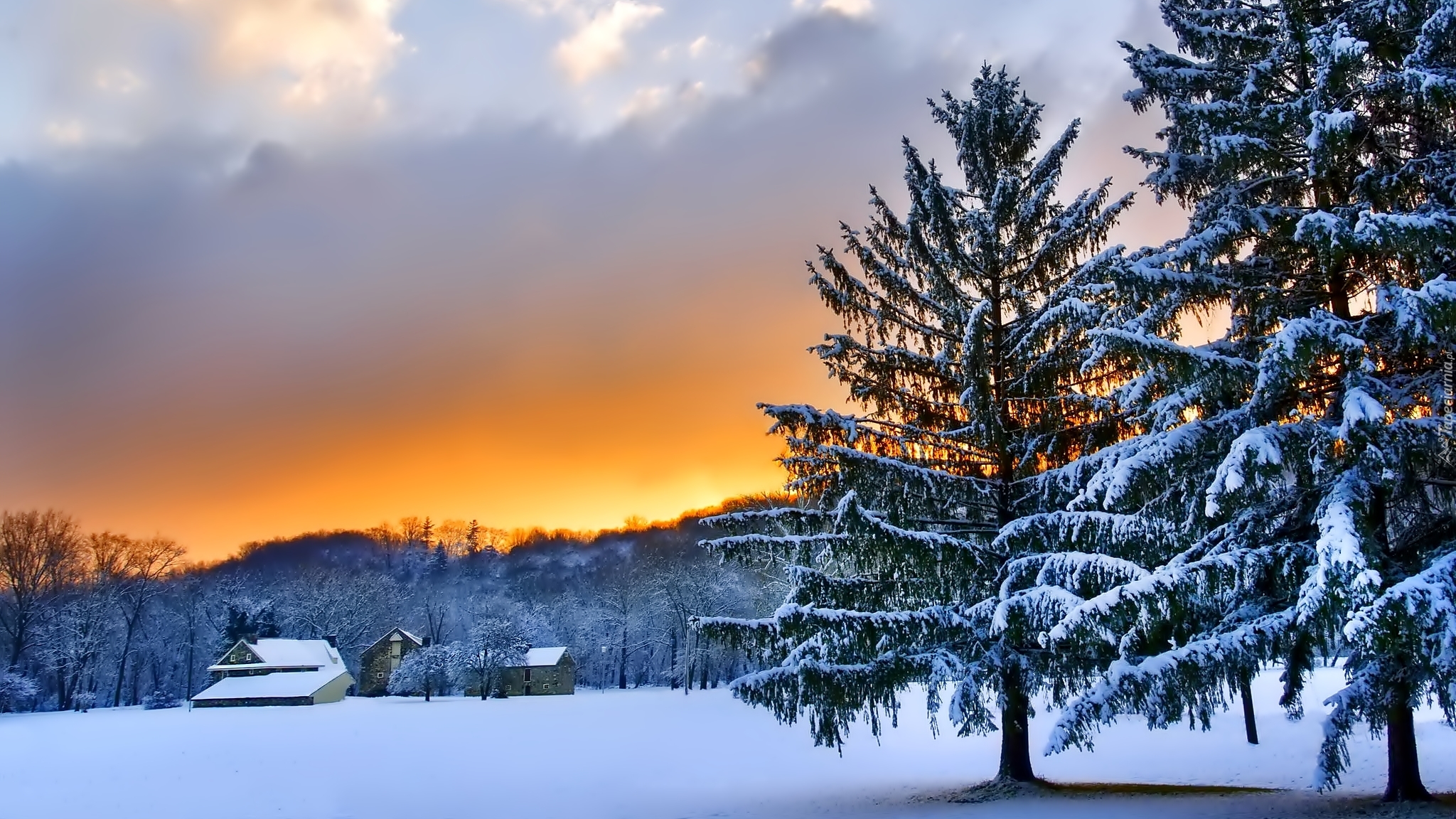 Edytor tapety: Góry, Lasy, Zabudowania, Zachód, Słońca, Zima