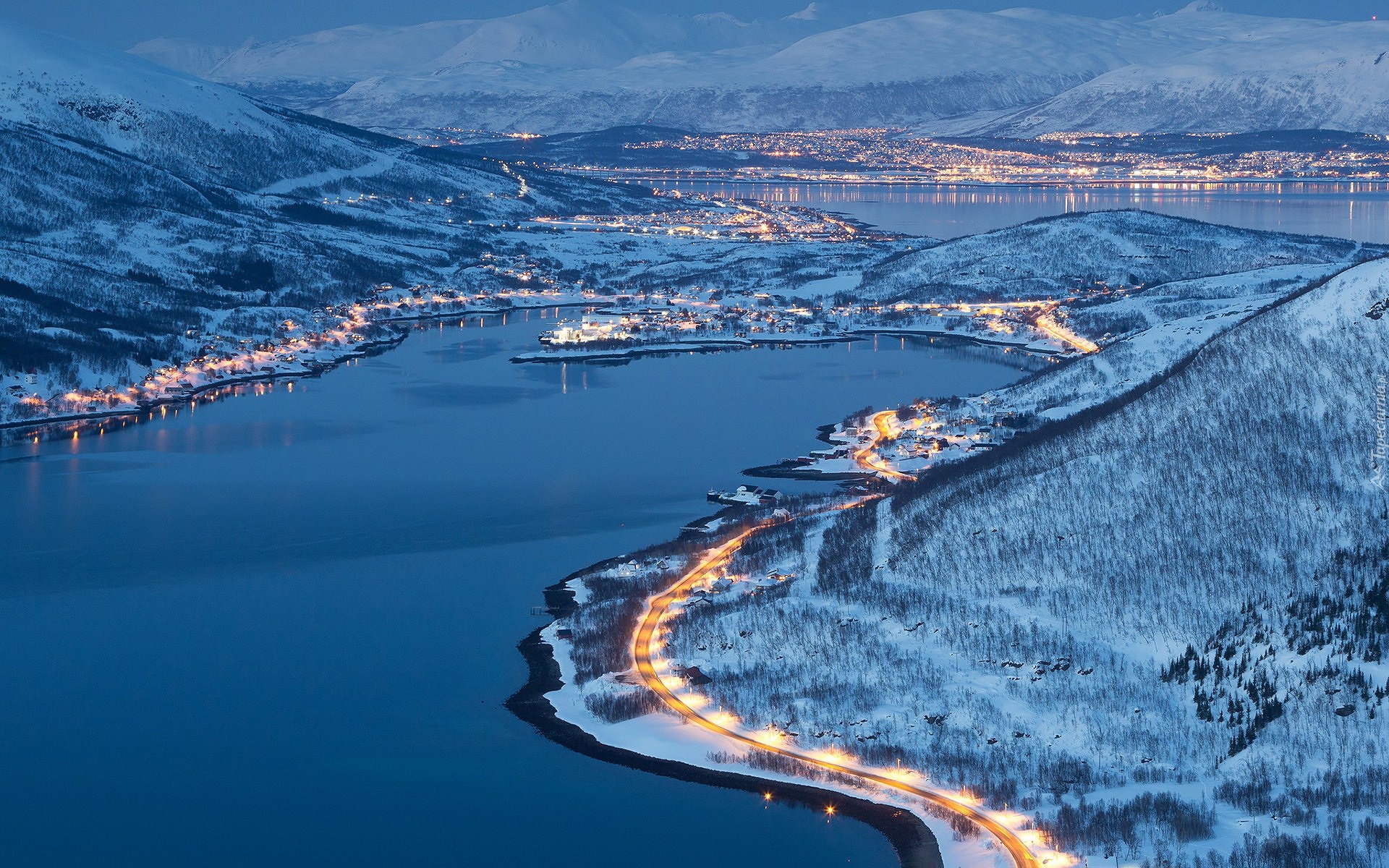 Edytor tapety: Morze, Zatoka, Zima, Oświetlony, Brzeg