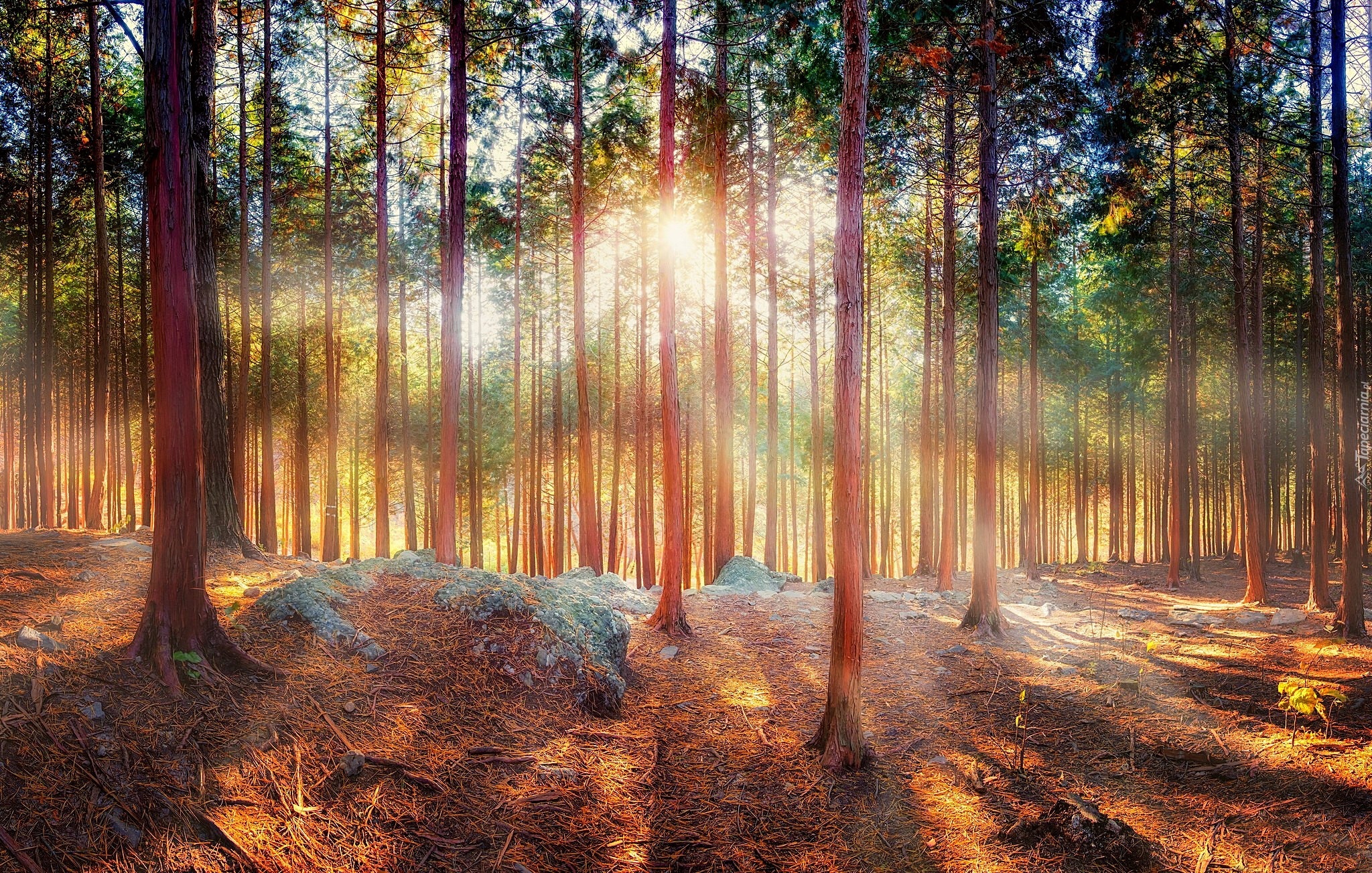 Edytor tapety: Las, Poranek, Wschód Słońca