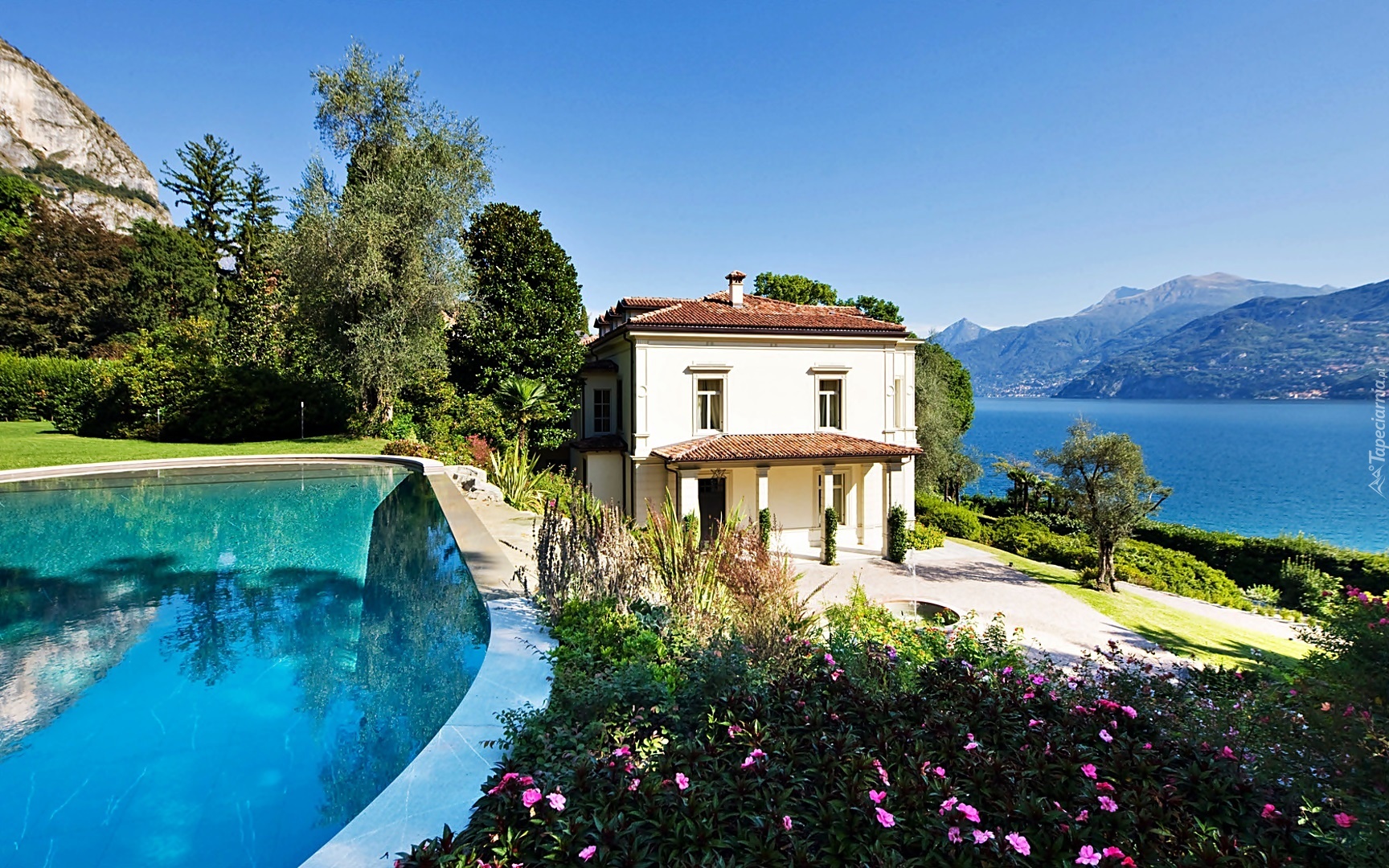 Edytor tapety: Wzgórza, Jezioro, Dom, Basen, Ogród