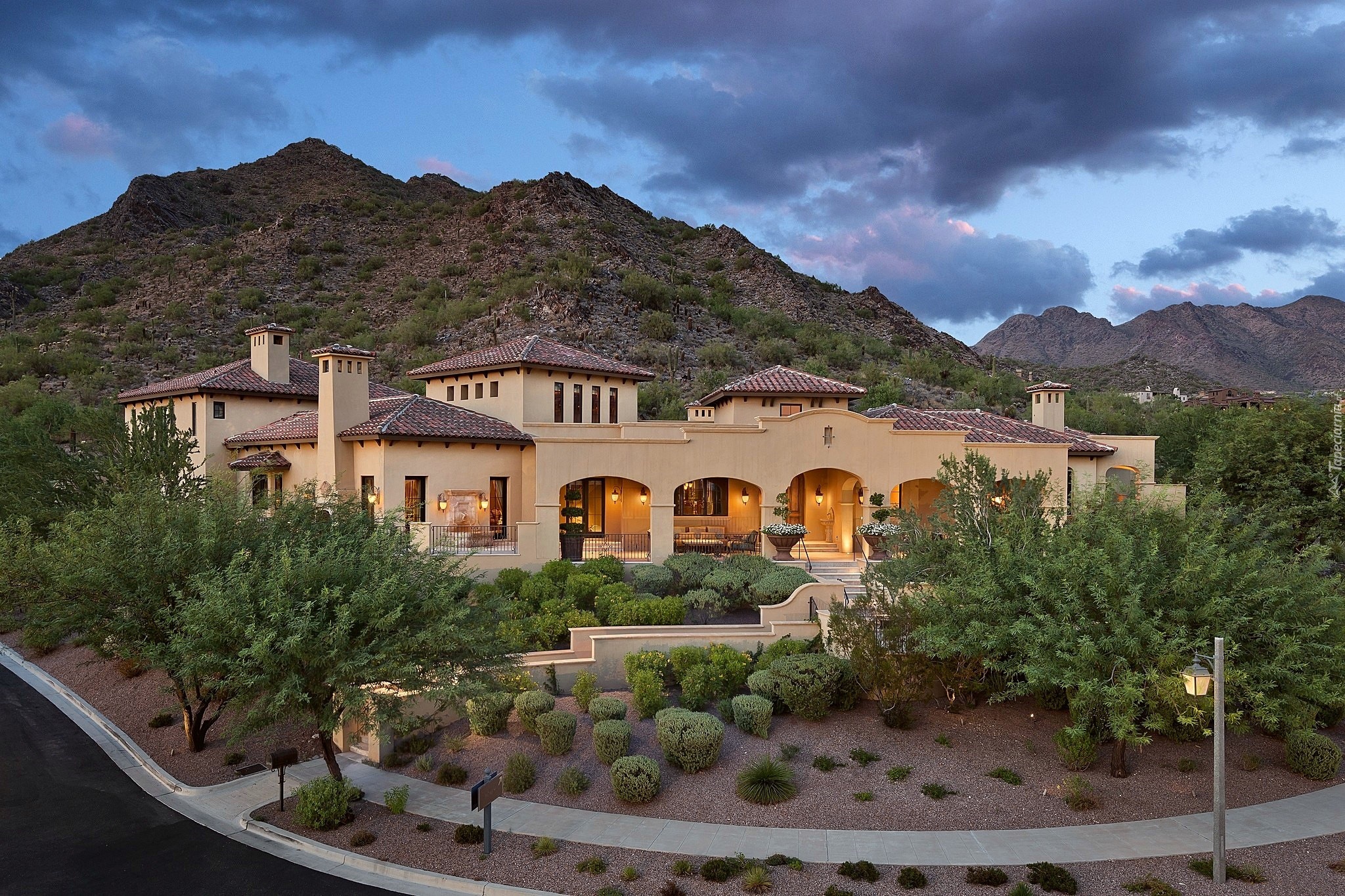 Edytor tapety: Góry, Oświetlony, Dom, Posesja