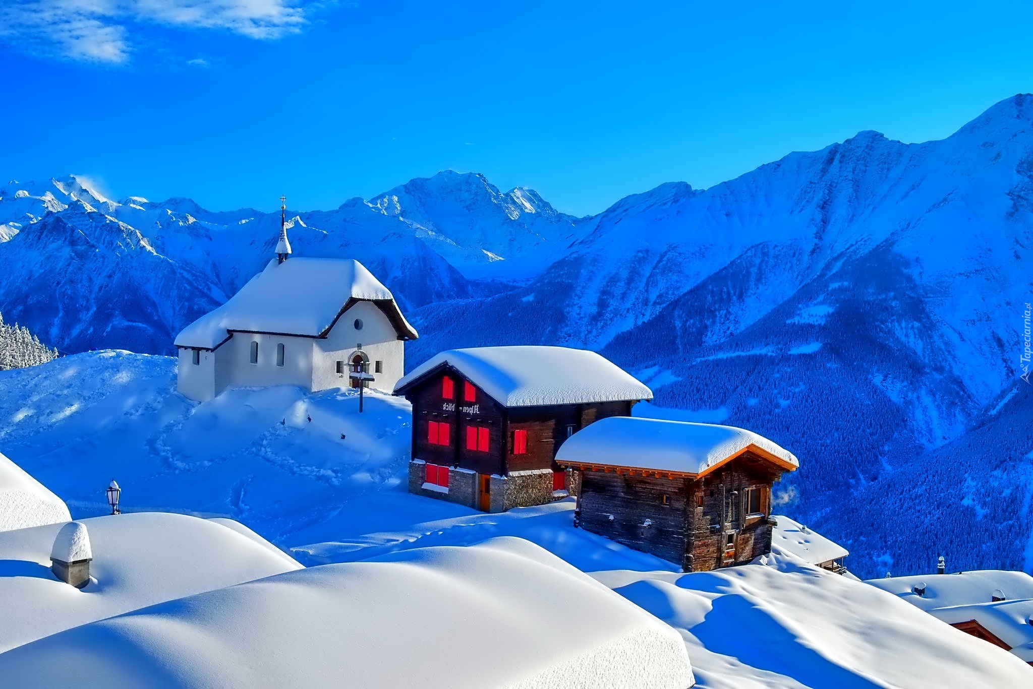 Edytor tapety: Zima, Góry, Kościółek, Ośnieżone, Domy