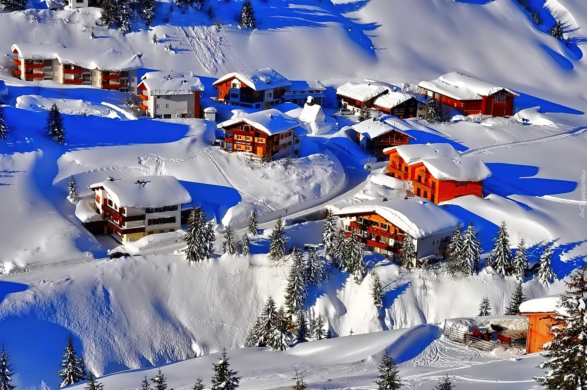 Edytor tapety: Zima, Góry, Dolina, Ośnieżone, Domy