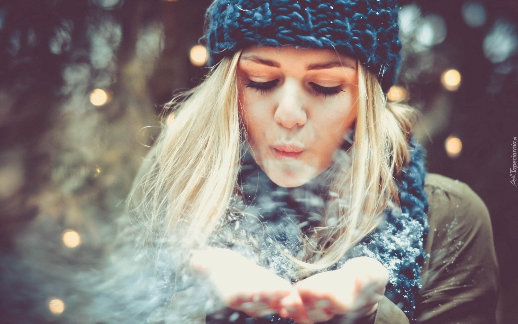 Edytor tapety: Piękna, Kobieta, Blondynka, Śnieg, Ręce, Zimowa, Czapka