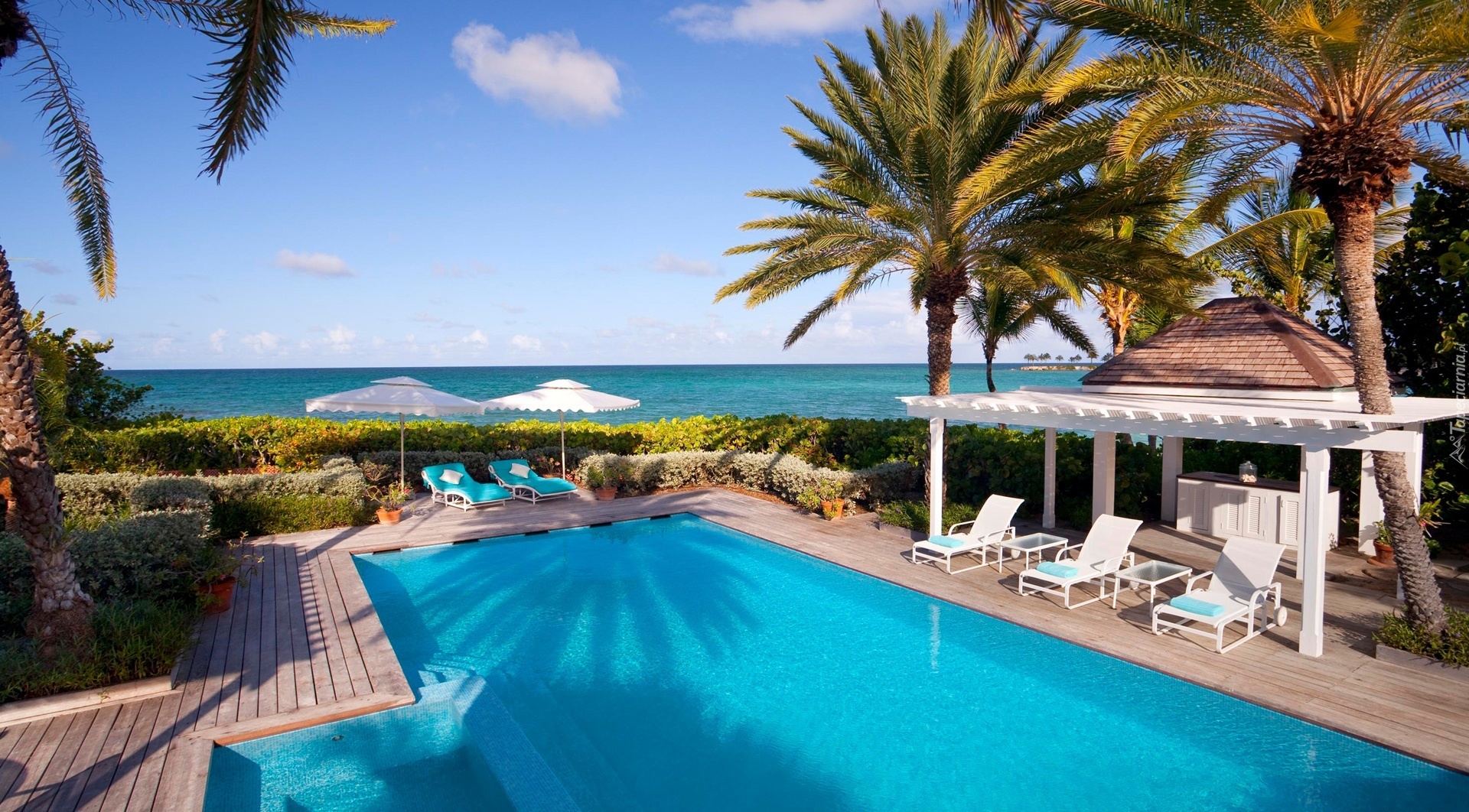 Edytor tapety: Basen, Leżaki, Palmy, Morze, Wakacje
