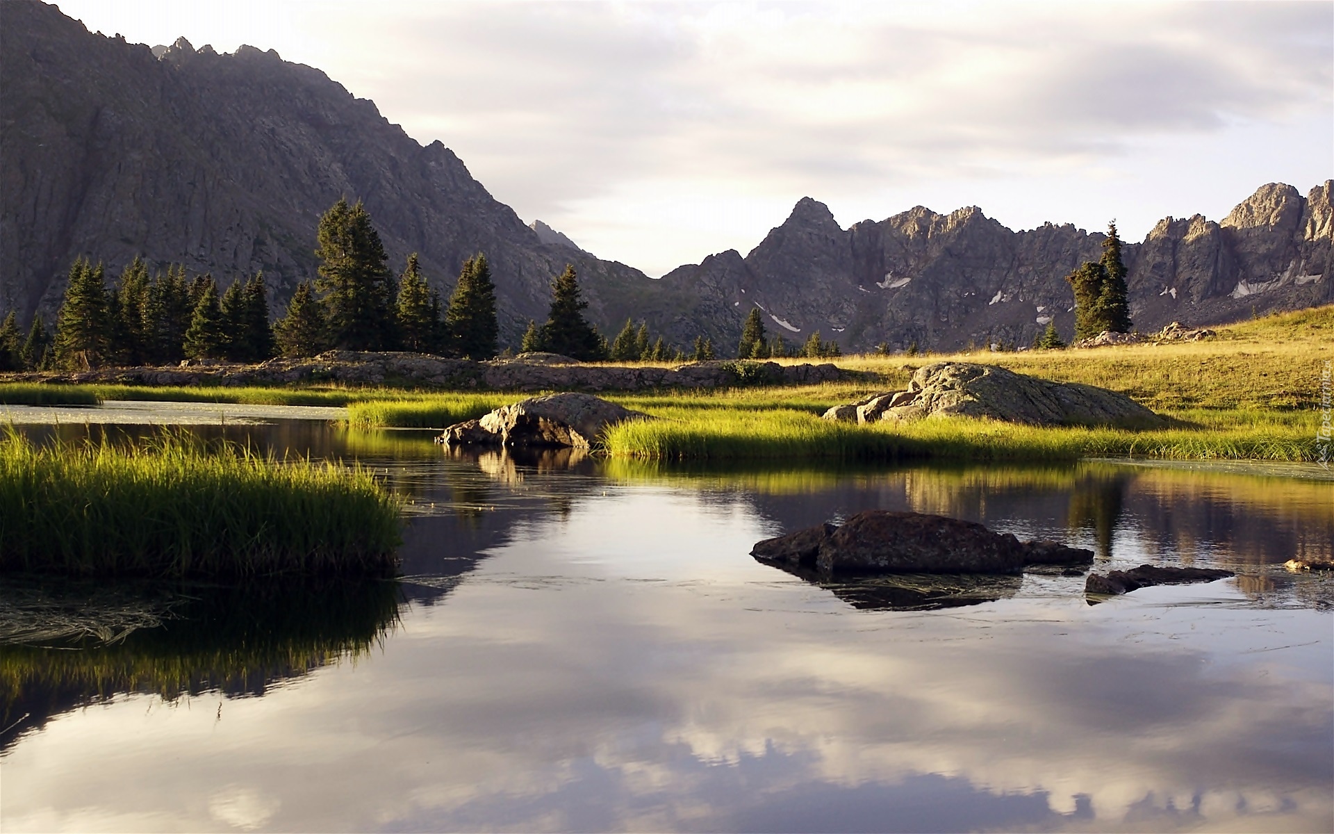 Edytor tapety: Świt, Góry, Las, Łąka, Rzeka, Odbicie