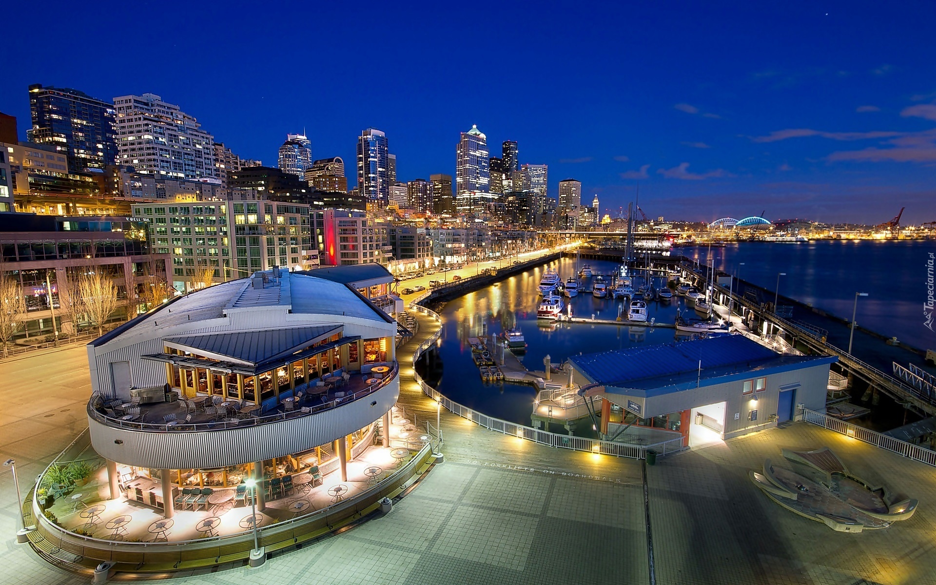 Edytor tapety: Seattle, Nocą, Marina, Jachty, Nabrzeże, Restauracja