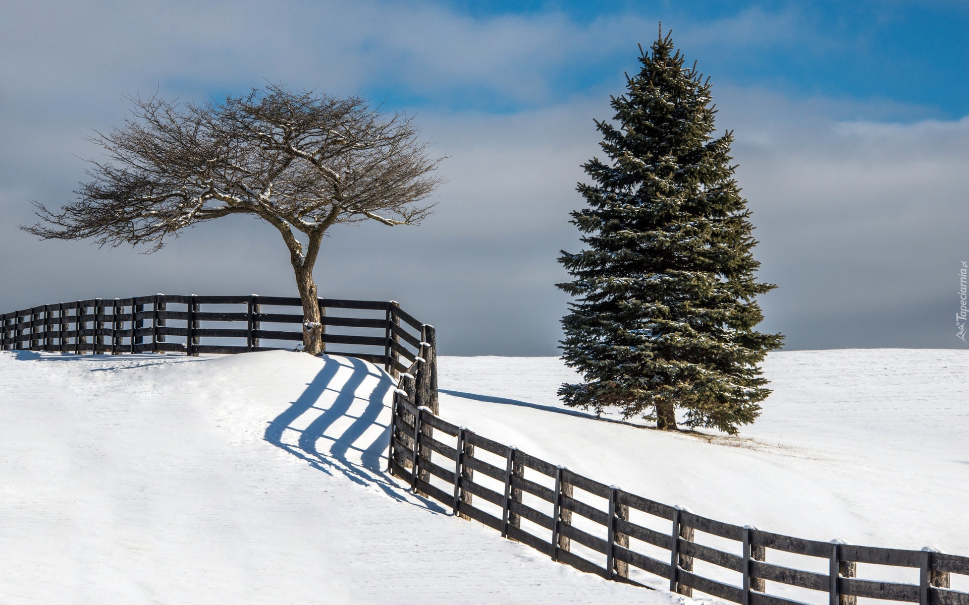 Edytor tapety: Śnieg, Pole, Dwa, Drzewa, Krzywy, Płot
