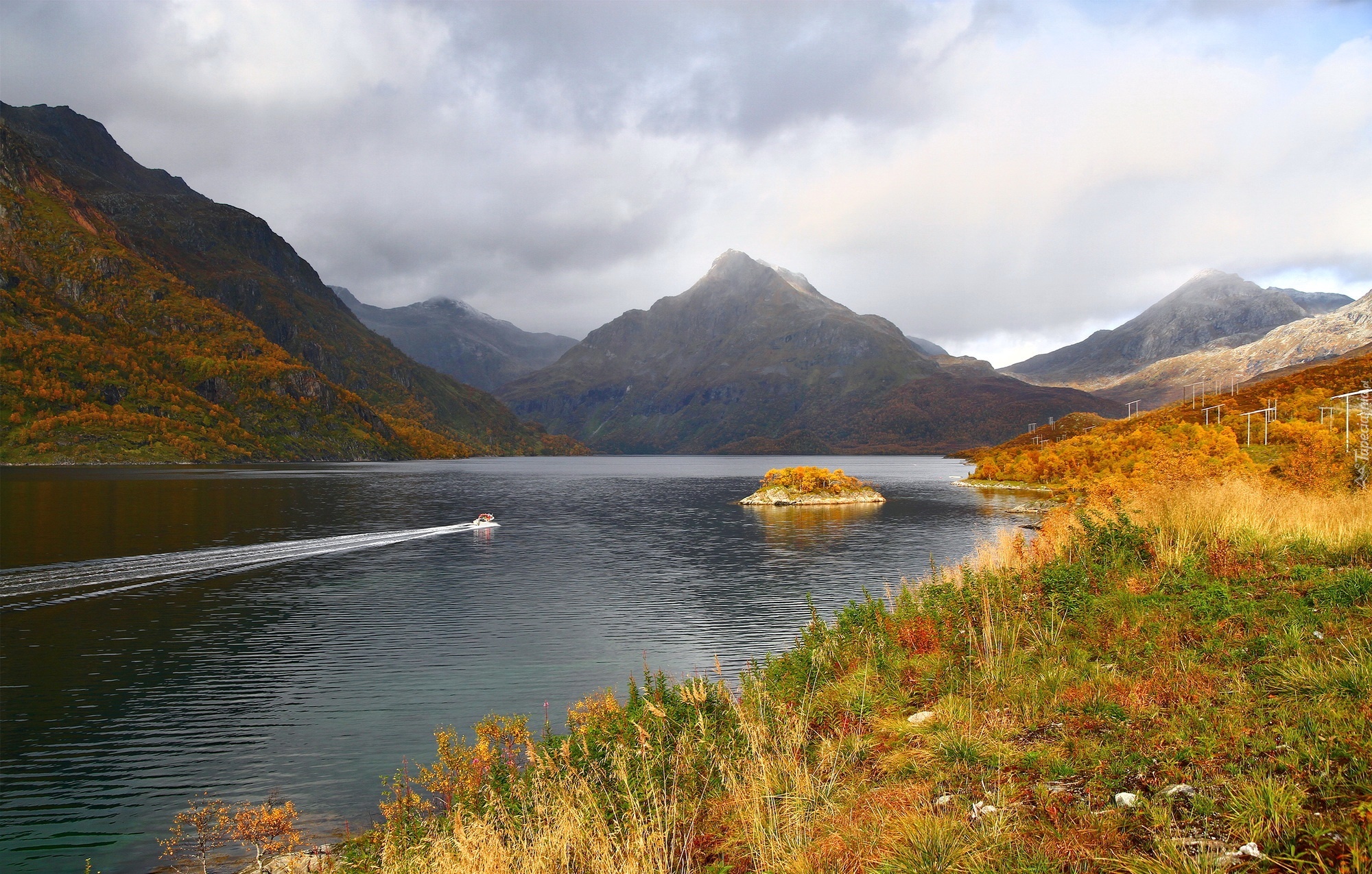 Edytor tapety: Góry, Jezioro, Wysepka, Motorówka, Jesień