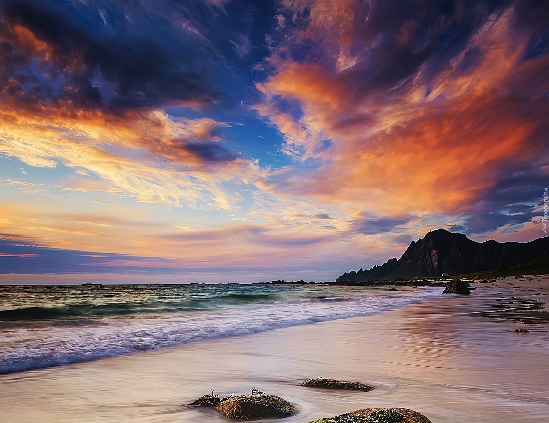Edytor tapety: Zachód, Słońca, Morze, Góry