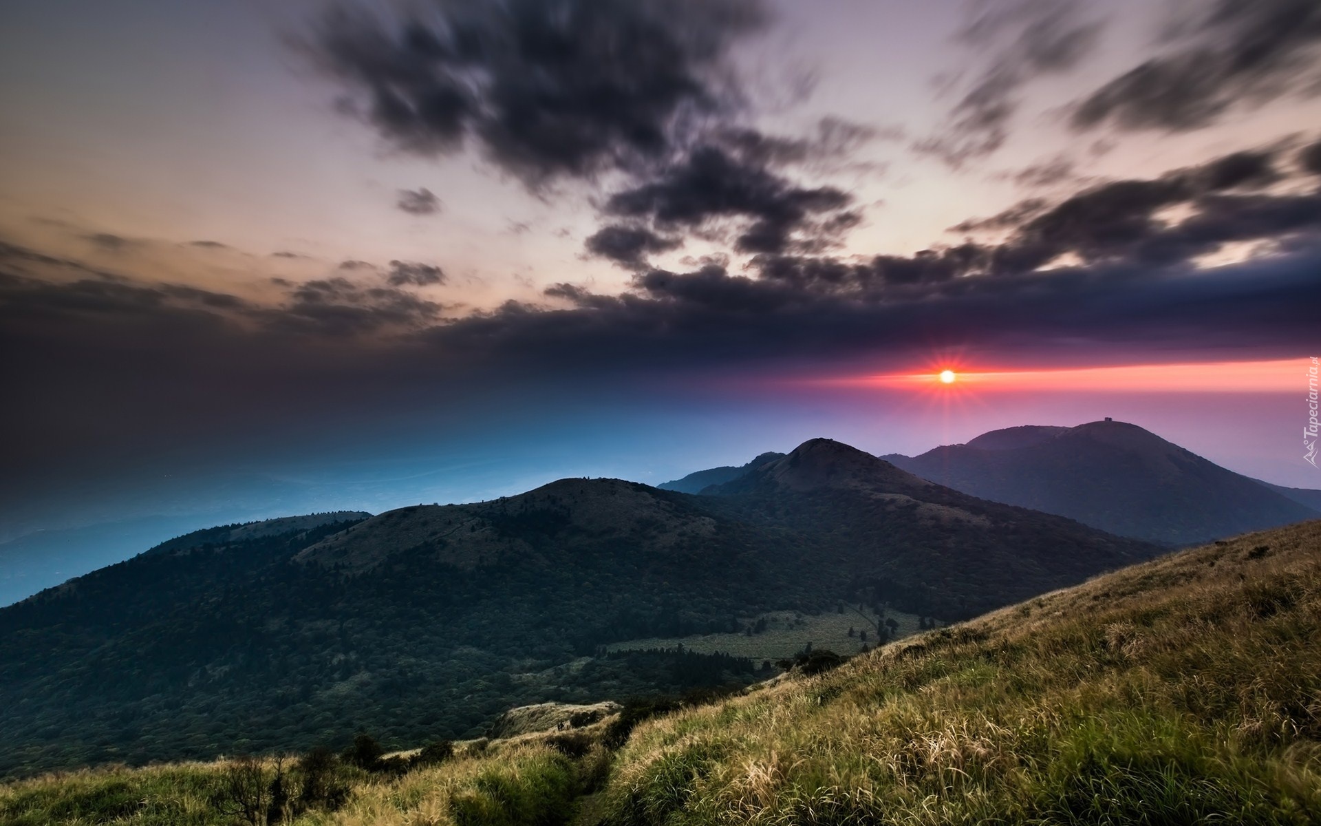 Edytor tapety: Góry, Zachód Słońca, Łąka