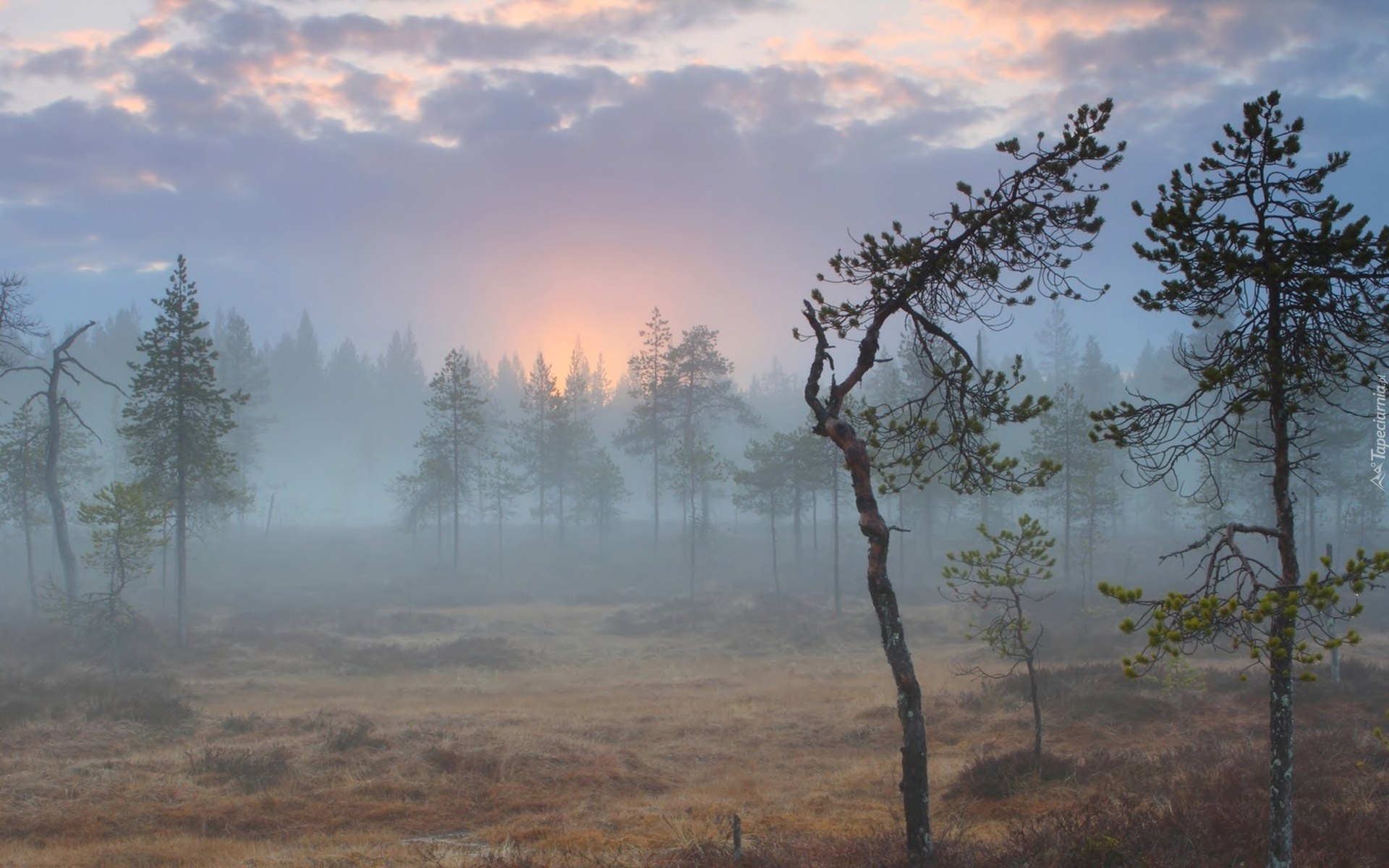Edytor tapety: Las, Zachód Słońca, Mgła