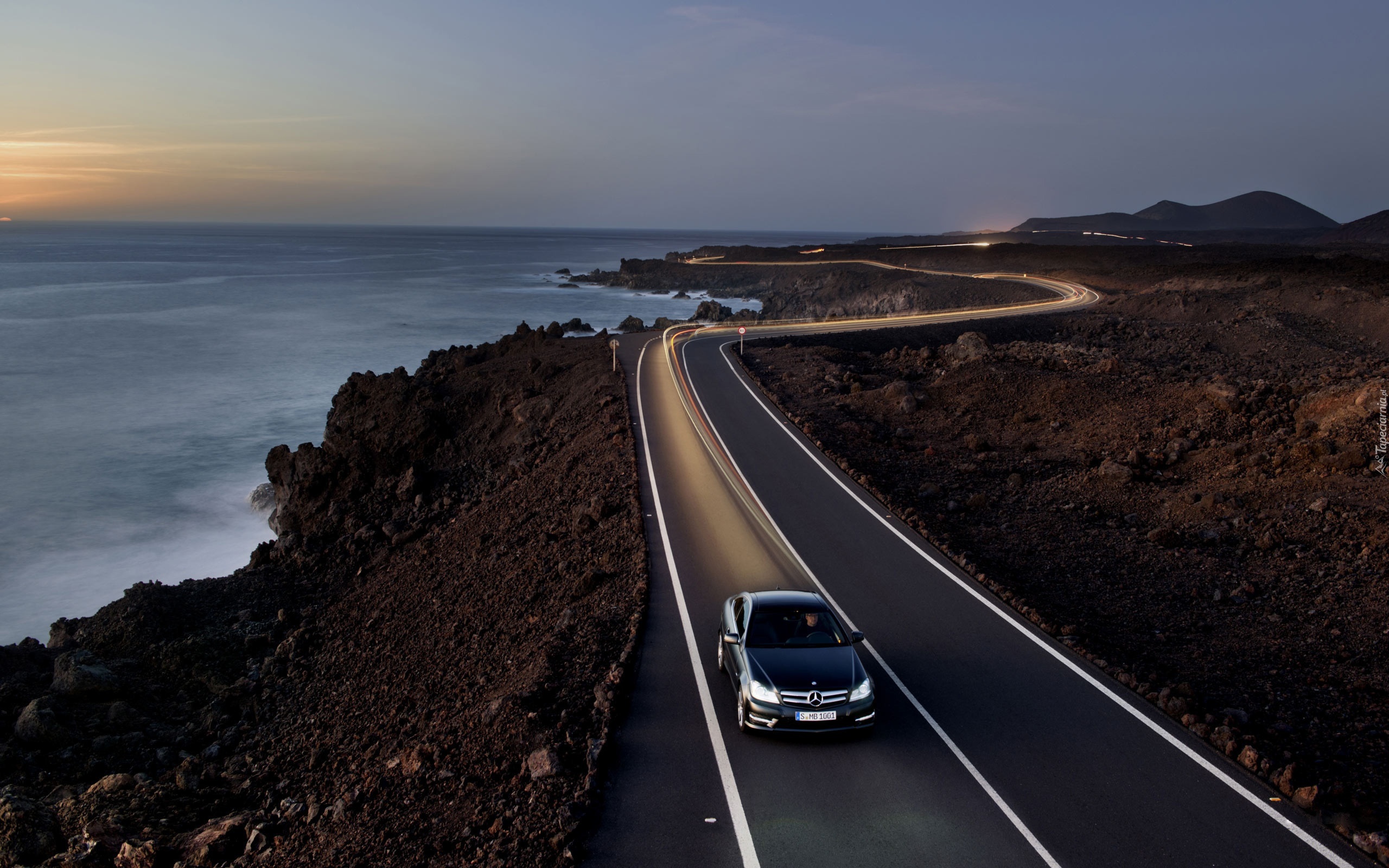 Edytor tapety: Mercedes, Droga, Wybrzeże, Zachód, Słońca