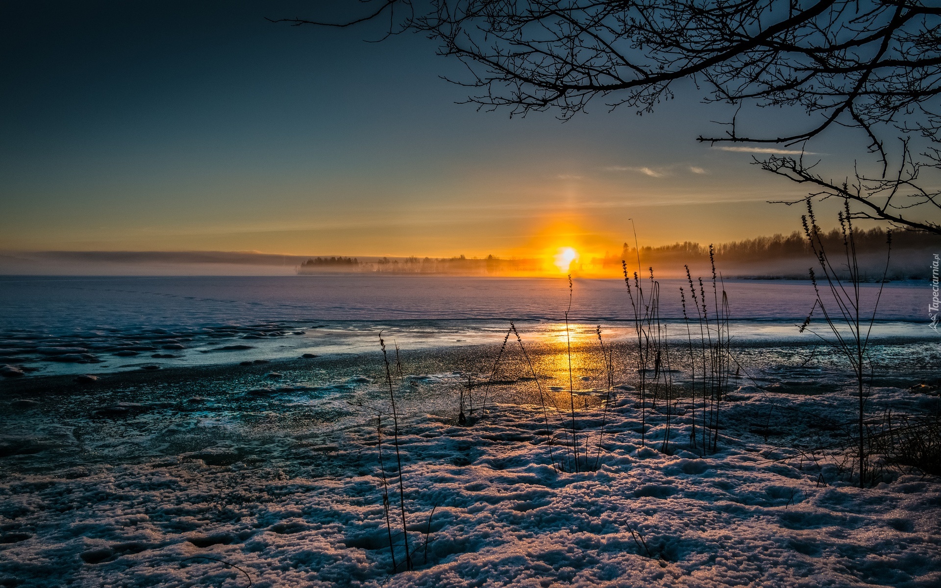 Edytor tapety: Pola, Lasy, Zachód, Słońca, Zima