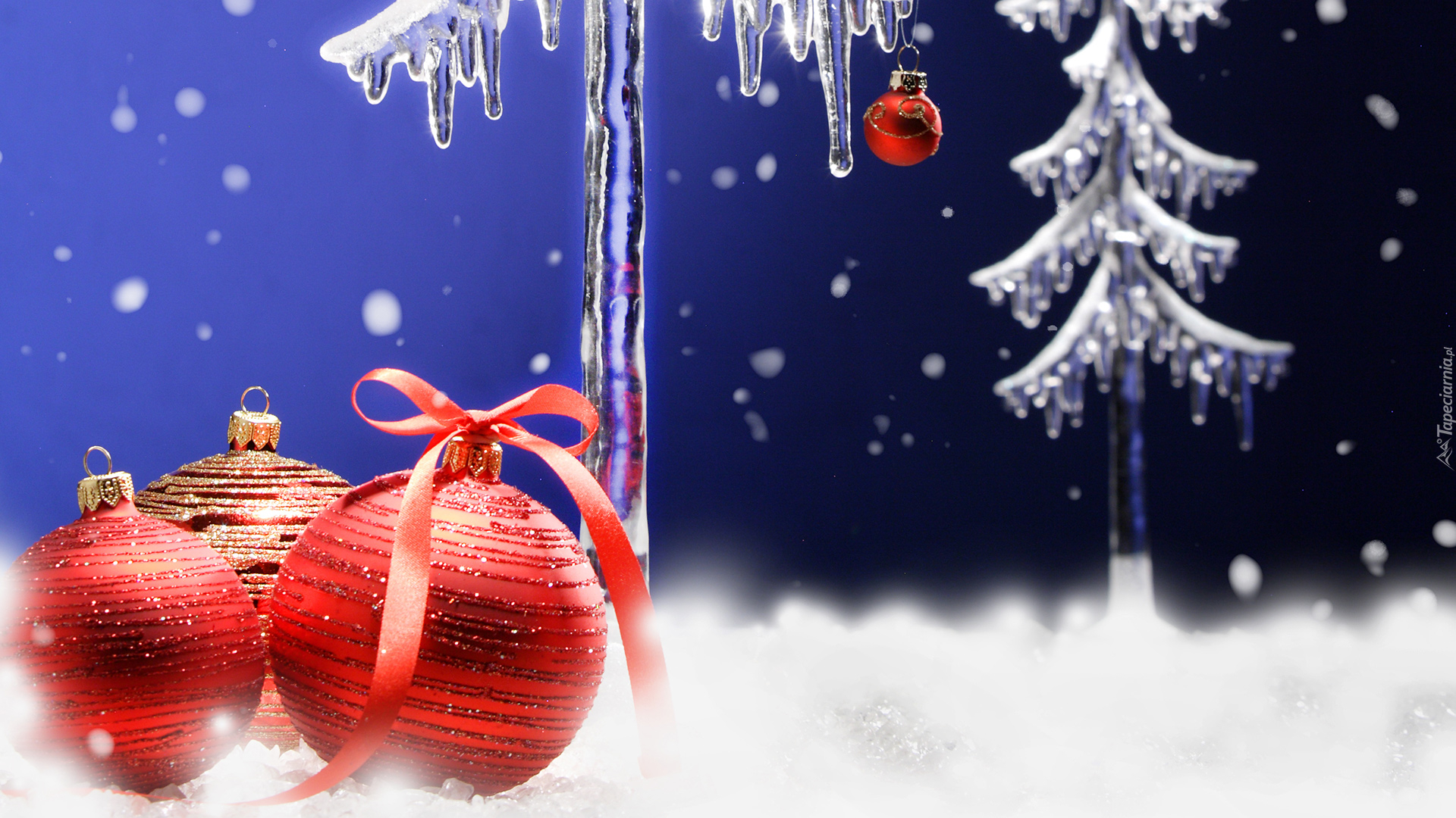 Edytor tapety: Boże, Narodzenie, Czerwone, Bombki, Sople, Lodu, Śnieg, Choineczka