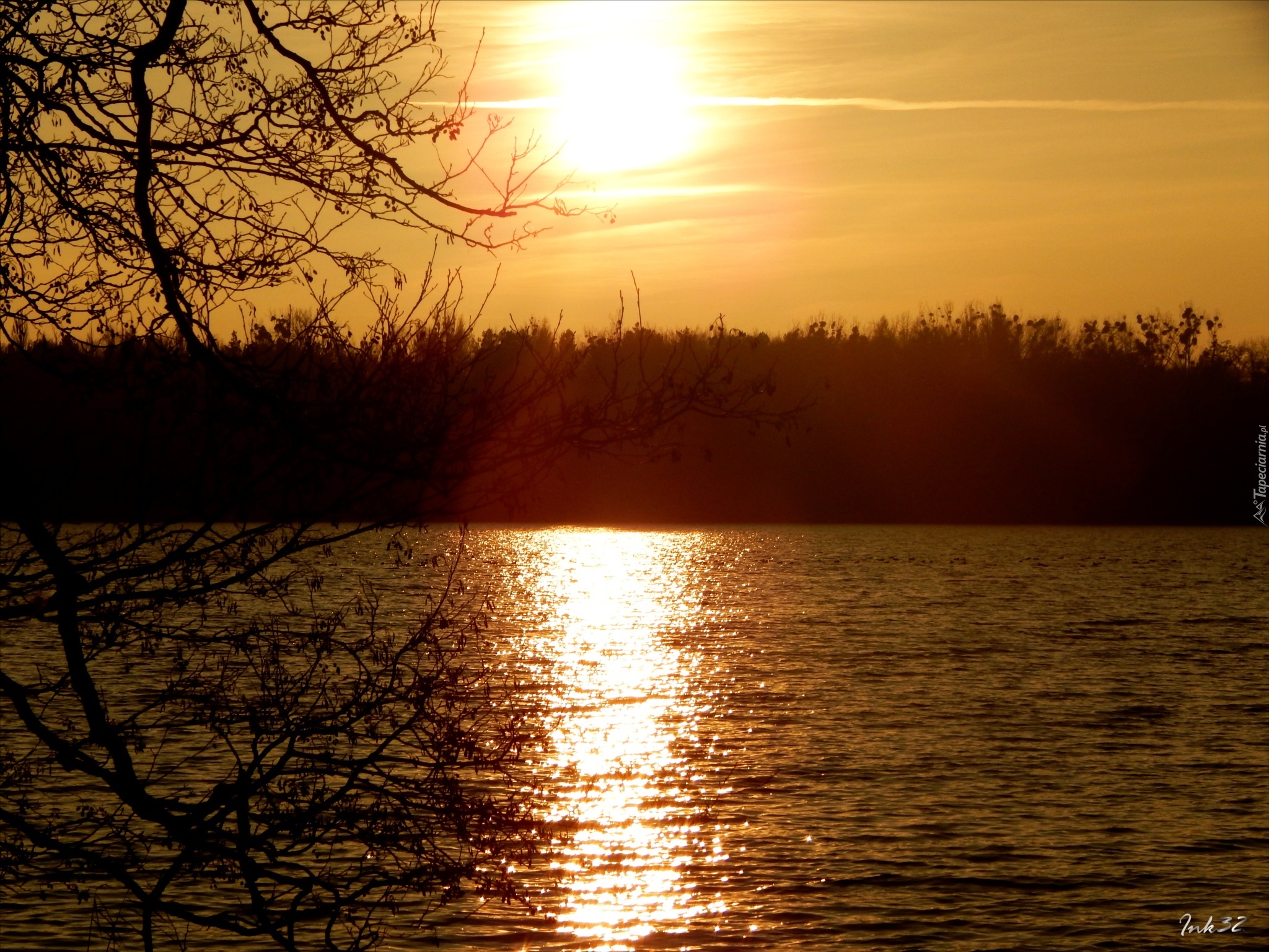 Edytor tapety: Jezioro, Zachód, Słońca, Gałęzie