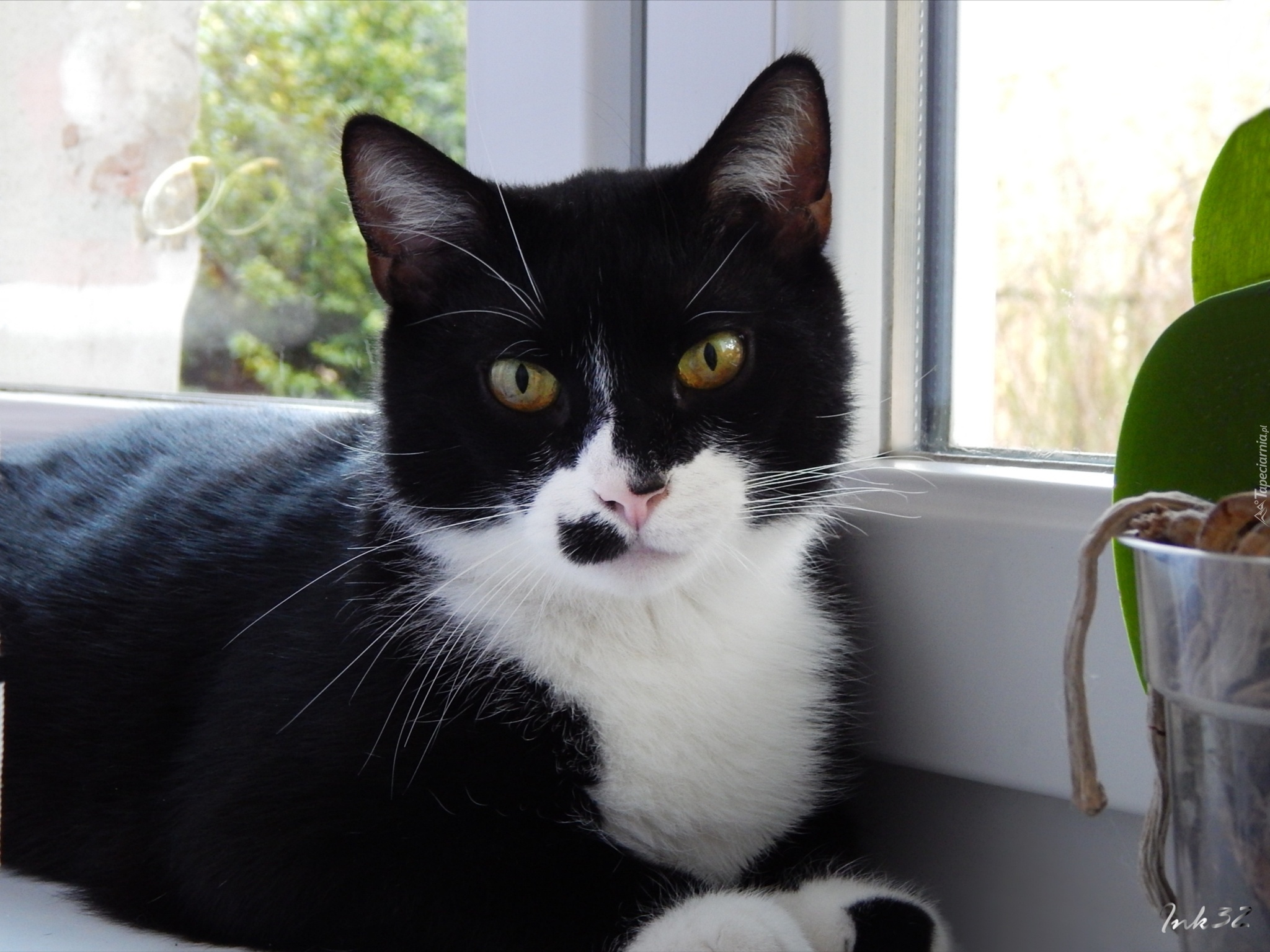 Edytor tapety: Łaciaty, Kot, Okno, Roślinka
