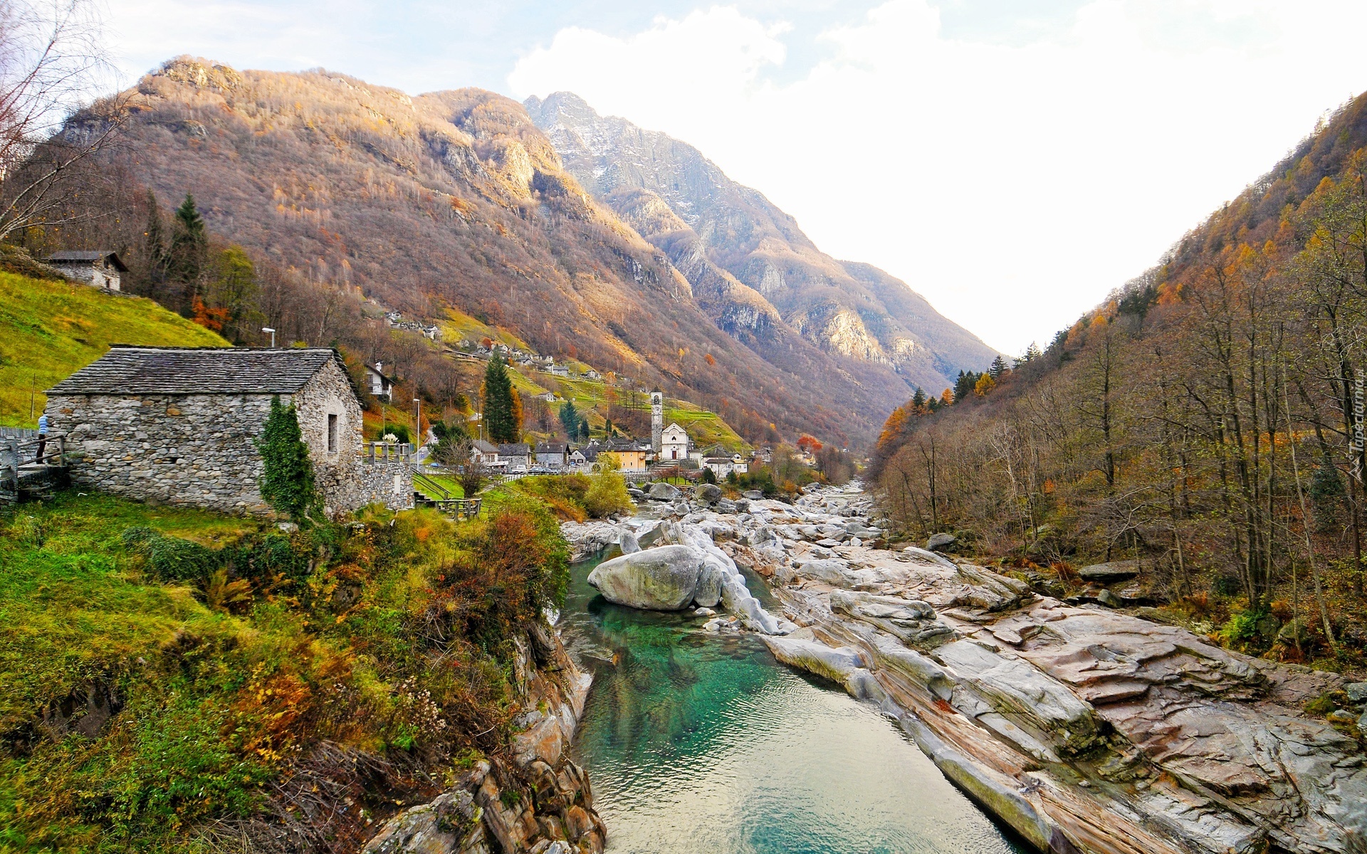 Edytor tapety: Góry, Potok, Domy, Wieś