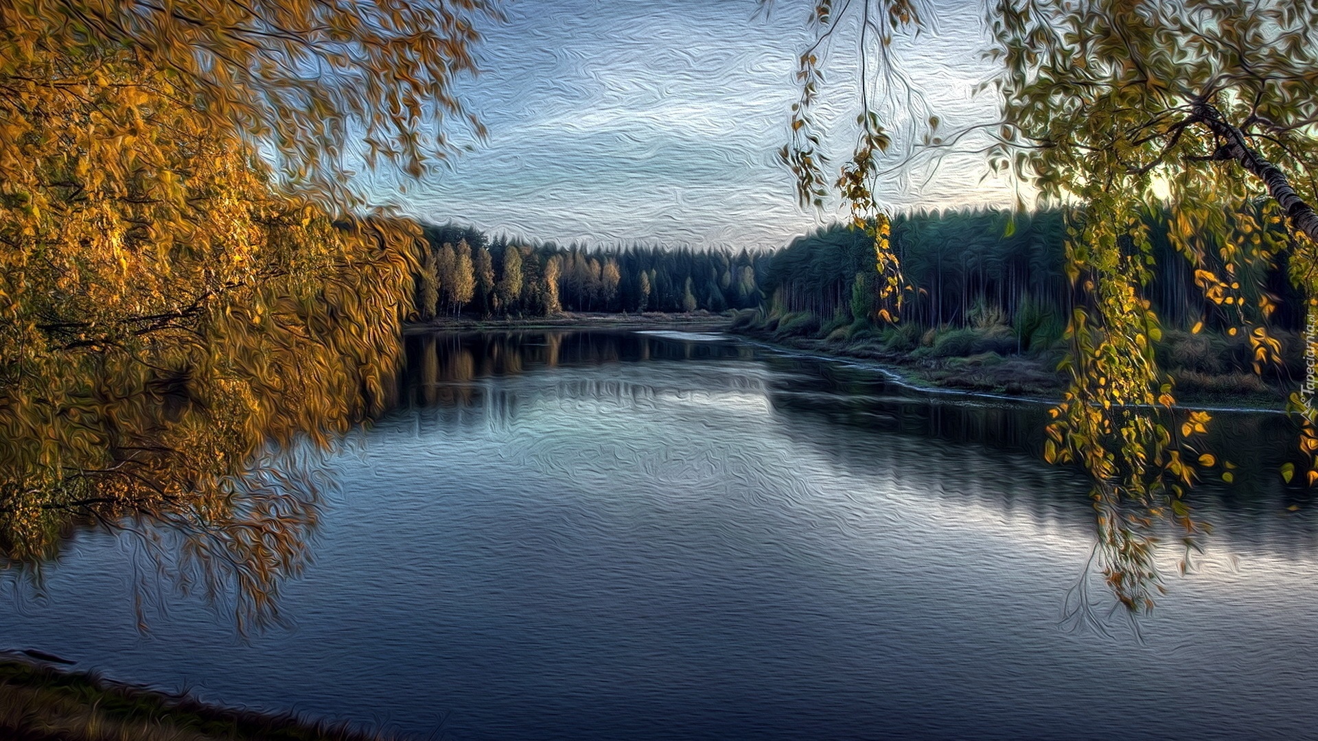 Edytor tapety: Obraz, Rzeka, Las, Gałęzie, Liście