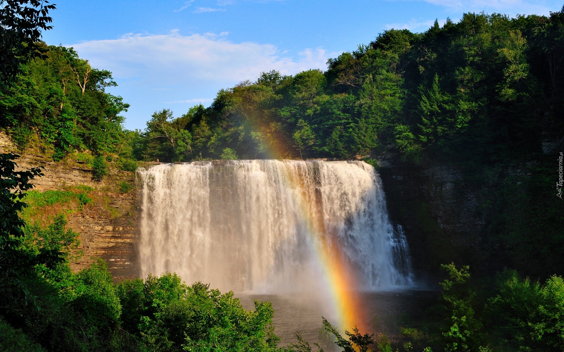 Edytor tapety: Wodospad, Tęcza, Drzewa, Las