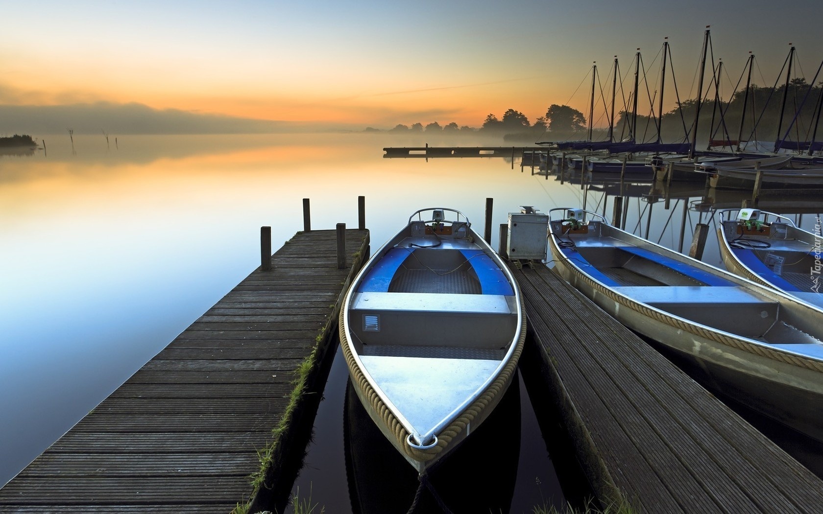 Edytor tapety: Wschód, Słońca, Świt, Jezioro, Łódki, Pomost